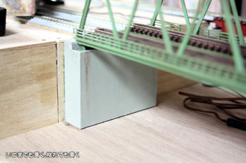 付属の橋脚では鉄橋と土手の部分とのつなぎ目の処理が不自然になるので、土手から続くような橋脚にしたほうがリアルかなと思って作ったのが右の橋脚です。0.5mm厚のボール紙からパーツを切り出して木工用ボンドでの組み立てです。鉄橋をのせてみると、ぴったりとおさまります。高さも問題ありません。線路の防音対策は、最終的には2mm厚のコルクシートにすることにしましたので、橋脚もその分を考慮した高さになっています。