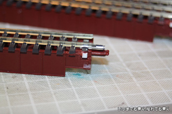 枕木とレールにレッドブラウンを吹き付けた後、マスキングテープをはがしてレール上面を磨き出します。