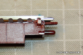 こするだけでも塗料は落ちますが、こするとレールの側面の塗装もつられてはがれることがありますので、私はシンナーを含ませた綿棒で軽くこすって落とします。