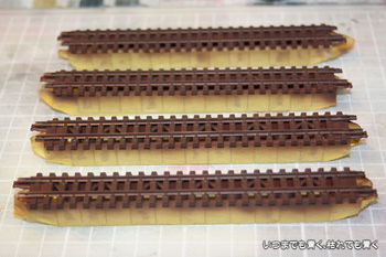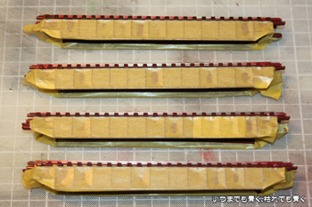 全体を塗装したあとは、枕木とレールを残してマスキングします。 カーモデルの塗装とは違いますので、細かい部分は気にしないで、ざっくりマスキングです。