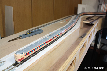 フレキシブルレールの固定や、上り線のフレキシブルレール置き換えを待つことができずに、さっそく先月末に購入してあった189系「あさま」12輌編成で試運転です。なかなかいい感じで緩やかなカーブを通り過ぎていきます。フレキシブルレール固定時にカントもつけますので、できあがればより実感的になると思います。