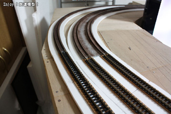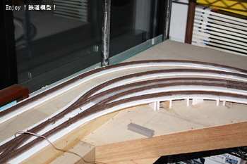 フレキシブルレールを仮置きして、緩やかなカーブの形を写してポップコーアとコルクシートでベースを作っていきます。緩やかなカーブは、ファイントラックのカーブレールとは違い、ベースを作っていてもカーブというより直線に近い感じです。本物の鉄道のカーブもそういう感じなんでしょうね。