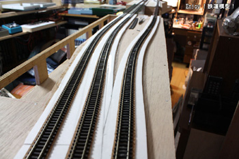 ポップコーアとコルクシートで作成した単線(貨物線)の線路路盤ができましたので、一昨日線路の準備を行い、本日線路の固定を行いました。