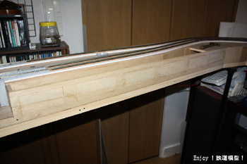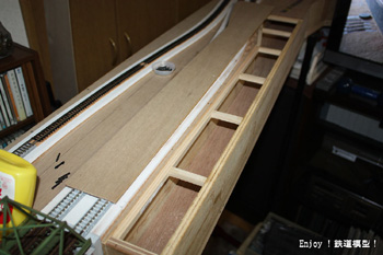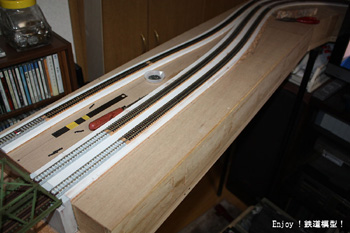 | 保守用の穴を埋めたら、次は上の路盤の修復です。もともとは勾配区間のつもりでしたので、路盤は無い部分になっていますので、あらたにベニヤ板を切り出してふさぐ必要があります。
