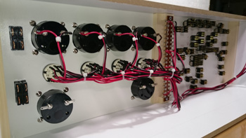 右側がパワーパックからの入力ターミナルになります。そこからのリード線を各ブロックのパワーパック選択ロータリースイッチに配線していきます。 |