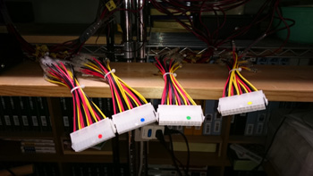 レイアウト側はこのように、24ピンコネクタが4個となります。コントロールパネルとの接続コネクタを間違わないように、カラーシールを張り付けています。 |