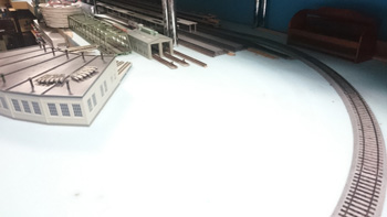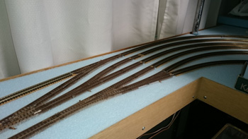 カーブはフレキシブルレールでリアルなカーブにしたい気持ちはありますが、HOは緩和曲線がなくても大きいせいでリアルに見えることがわかっていますので、ここは割り切って既存の道床レールを使うつもりです。 |