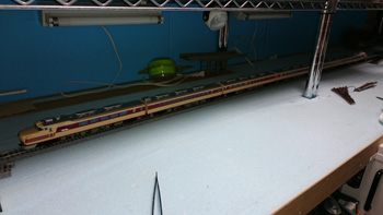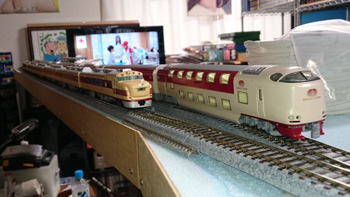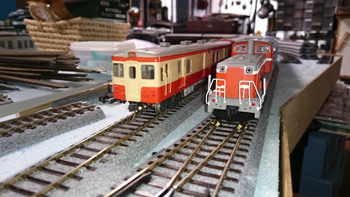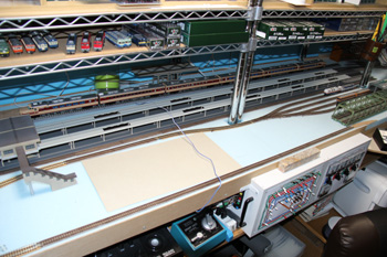 N(9mm)の線路をとっぱらったあとに、HO(16.5mm)の線路を置いてみました。Nで15輌編成も余裕だった駅部分は、1/80だと6輌編成がやっとです。フル編成は無理だけど、見え方や走らせるスピードなどNとは桁違いにリアルなので、短編成でも絵になって走らせて楽しいです。手前のスペースにはNの複線エンドレスを置いて、フル編成も楽しめるようにするつもりです。遅きに失したHO(正しくは16番というのでしょうが)デビューです。 |