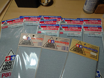 | 昨日盛ったパテを整えようと思って作業を始めたら、使いやすい600番の切り出したペーパーが無くなりました。切り出し前のストックが一枚くらいあるだろうと思って探しましたが、肝心の600番だけありません。600番のような荒目のものはカーモデルにはあまり使わないので、買っていなかったのも仕方がありませんが、欲しいものだけがないというのはやる気を削がれますね。少し効率が落ちますが、800番で代用します。 |