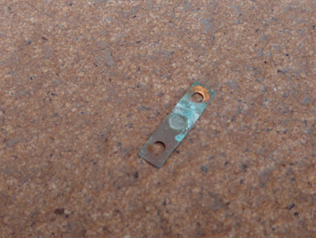 | あらためて換気扇フードが閉まっていた原因を調査しました。このしくみは、防火ダンパーと言うそうで、火災時に内部の熱気や炎が外に出ないようにするためのものだそうです。換気扇フードの下を調べると、金具がひとつ落ちていました。バネに残っていた金具と並べてみると、このふたつはハンダでひとつにくっつけられていて、バネと金属板の間に取り付けられていたようです。通常ならば高温にならないとハンダが溶けて離れることはありませんが、たぶん劣化でハンダが剥がれふたつに別れて防火金属板が閉まったということみたいです。いつそうなったかはわかりませんが、金属金具の状態からそんなに前ではなさそうです。 |