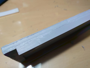 | 昨夜失敗した高架線路盤の側面ですが、最初から側面を処理しなかったのがそもそも間違いだったと反省し、今夜は側面にボール紙を貼り付けました。幸いにも昨夜盛ったパテは硬化していて徐々に溶けていくということはなさそうです。 |