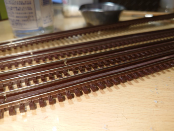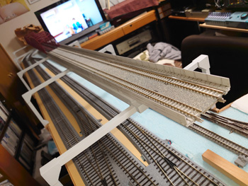 | 大トラス鉄橋のレールの側面を塗って、トラスの塗装艶を抑える塗装を上塗りして、高架線線路の側壁を塗って(少し汚しも入れて)、それらをレイアウトに固定するところまで進みました。 |