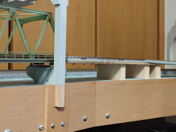| Nゲージ線路の鉄橋の奥の勾配が滑らかではないところがあるので、きちんと内部の橋脚をつくって滑らかになるように修正します。 |