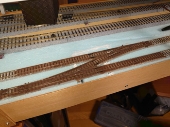 | Nの地上線の複線には両渡り線(ダブルクロスポイント)を2ヶ所入れてありますが、機関区に入るところの両渡り線はオーバースペックなので、片渡り線に変更しました。ポイントマシンの位置も変わりますし、敷設後の線路取り替えはかなり面倒なので迷いましたが、まだ情景の作り込み前なのでなんとか無事に取り替え工事を終えることができました。使わなくなったダブルクロスポイントは、新幹線用の高架線(工事中)に使います。 |