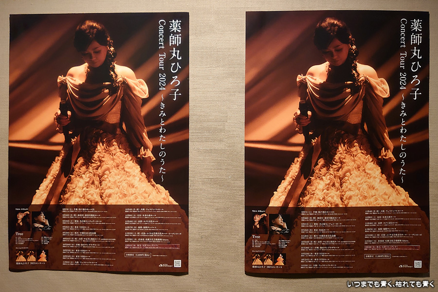 皆さま、本日はようこそ「2024コンサートツアー〜きみとわたしのうた〜」にお越しくださいまして本当にありがとうございます。薬師丸ひろ子です。名古屋にもよくお邪魔していますが、この名古屋センチュリーホールでコンサートをさせていただくのは初めということでこんなに多くのお客様にお目にかかれて頑張らなくちゃという気持ちになっています。私は、この大袈裟なドレスを着ていますしほとんどここから動くことはありません。皆さんに無理強いして立っていただいたり辛い思いをさせることもありません。何も皆さんに強要することはありません。今日は楽しんでいただきたいと思います。次はアルバム「Tree」から「今日」という歌を聴いてください。