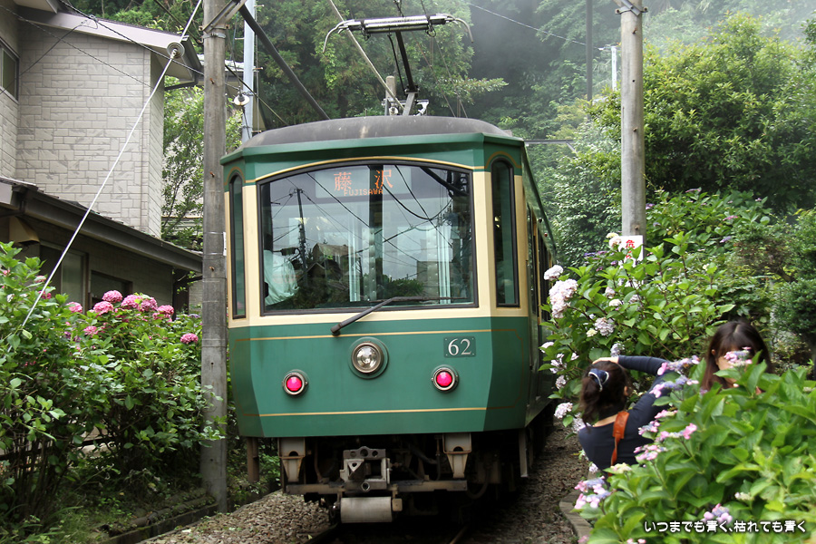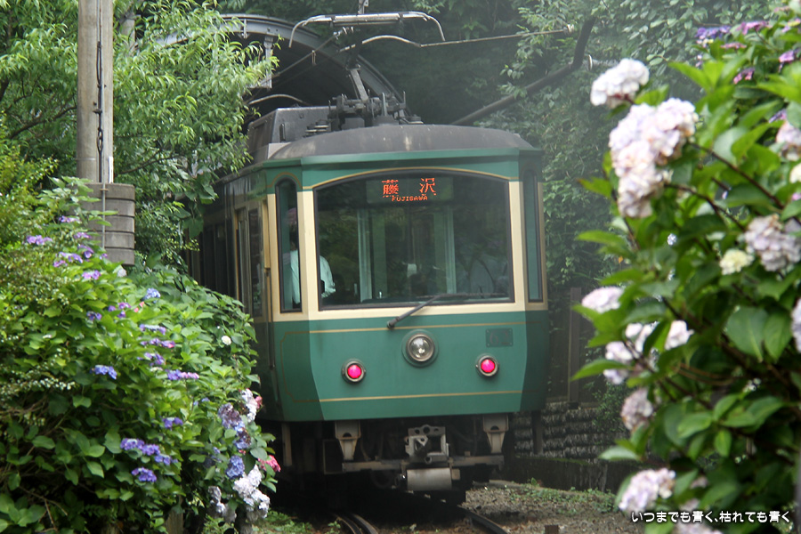 2012年6月25日に撮影した、神奈川県鎌倉市・江ノ電と紫陽花の写真です。