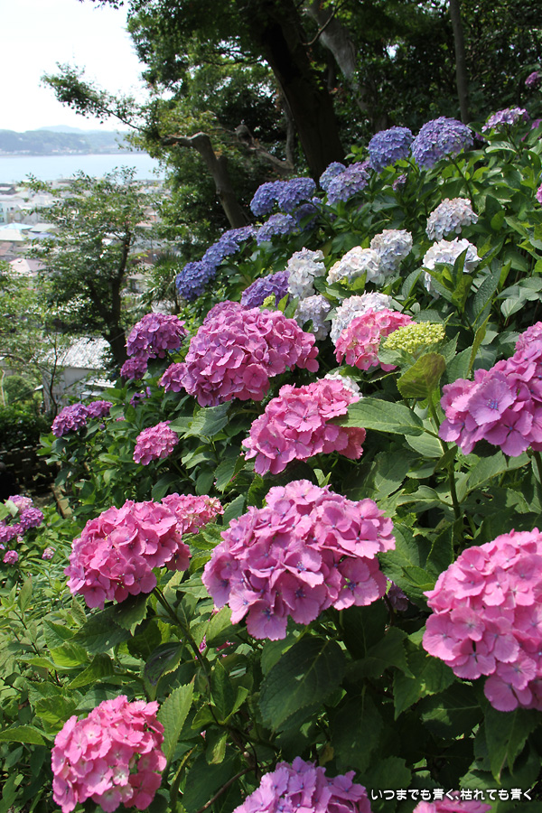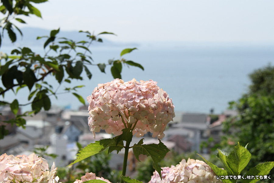 この時期の長谷寺の眺望散策路は、訪れる人が多く平日でも昼前には入場制限がかかってしまいます。制限なくゆったりと楽しむために、奥さんとホテルで早めの朝食をとり、横須賀線と江ノ電を乗り継ぎ、朝一番で訪れました。そのおかげで、人の入らない写真や、距離を置いての撮影も可能でした。今年の長谷寺眺望散策路の紫陽花は、数も多くて見ごろの美しい紫陽花が多く、由比ガ浜もきれいに見えましたし、私が来るようになってから一番の満足度でした。奥さんは、長谷寺の紫陽花は初めてでしたが、部晴らしいと感激して楽しんでいました。