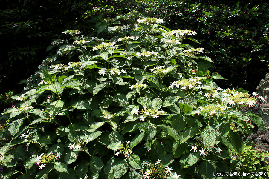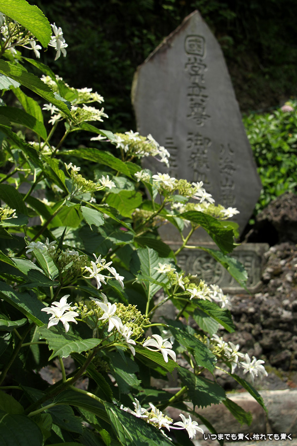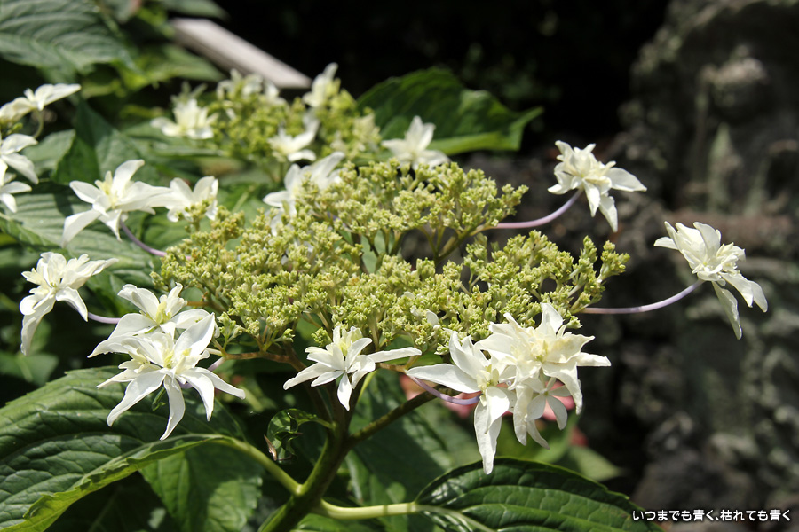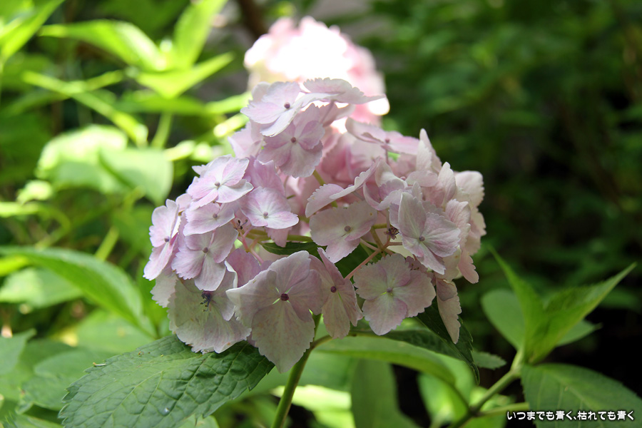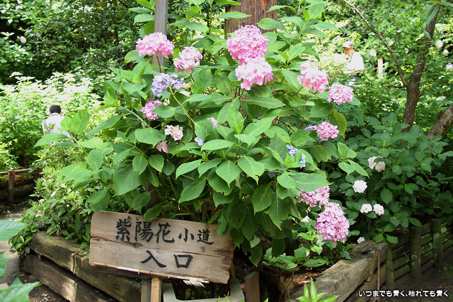 長谷寺の紫陽花を見たあとは、必ず御霊神社の境内を通って神社前の江ノ電の踏切で江ノ電の撮影を行いますが、御霊神社にも紫陽花の小道があって本堂のまわりの紫陽花ををぐるりと一周楽しめます。今年はちょっと数が少ないようで寂しい感じがしました。ここには八丈千鳥という6月と10月に咲く紫陽花があります。