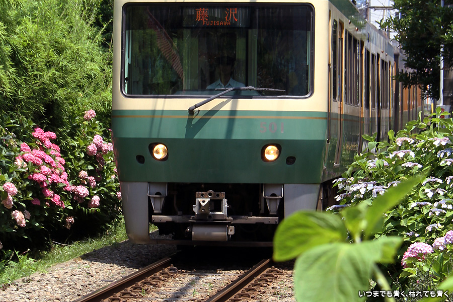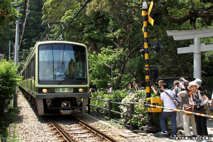 2013年6月17日に撮影した、神奈川県鎌倉市・江ノ電と紫陽花の写真です。