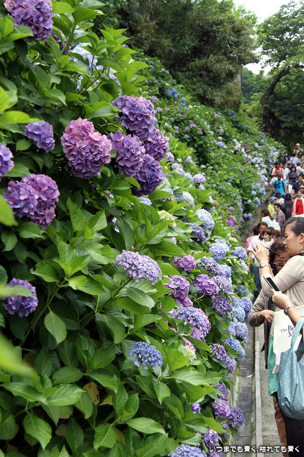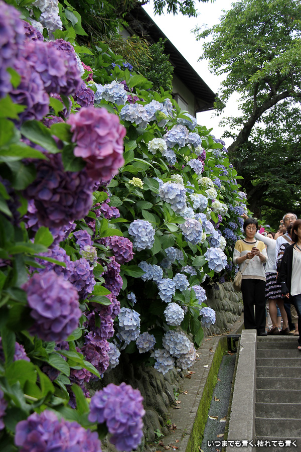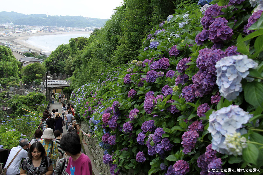 成就院の石段の参道の両側に咲く多くの紫陽花を見ながら望む由比ガ浜の景色はとても素晴らしい景色です。曇り空で海岸が少し霞んでいるのが残念でしたが、ここの紫陽花はちょうと見頃で美しく、見に来て良かったと思います。