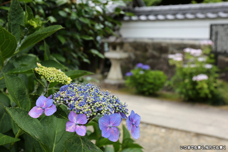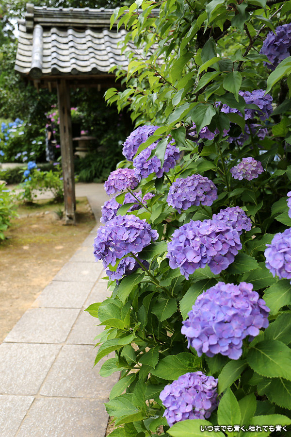 三河のあじさい寺、瑞雲山本光寺の紫陽花を家族で見に来ました。このお寺に紫陽花を見に来たのは今年で5回目(2010年、2011年、2012年、2014年、2016年)ですが、今日は、その5回の中で一番きれいではないかと思えるほど、花の状態が良かったです。すべての花が咲き始めたばかりの美しさで、目立つ傷みも全くありませんでした。そういう見ごろ最良日のせいか、私たちが帰る頃には駐車場に向かう道にクルマの行列ができるほどの人の多さでした。写真を撮る人も多くて、撮ろうとする構図の中からなかなか出てくれないのはお互い様で仕方がありませんが、あじさいの花の前でずっと三脚を置いたままにしていたり、カメラ談義を長々とするのだけはご勘弁といった感じでした。