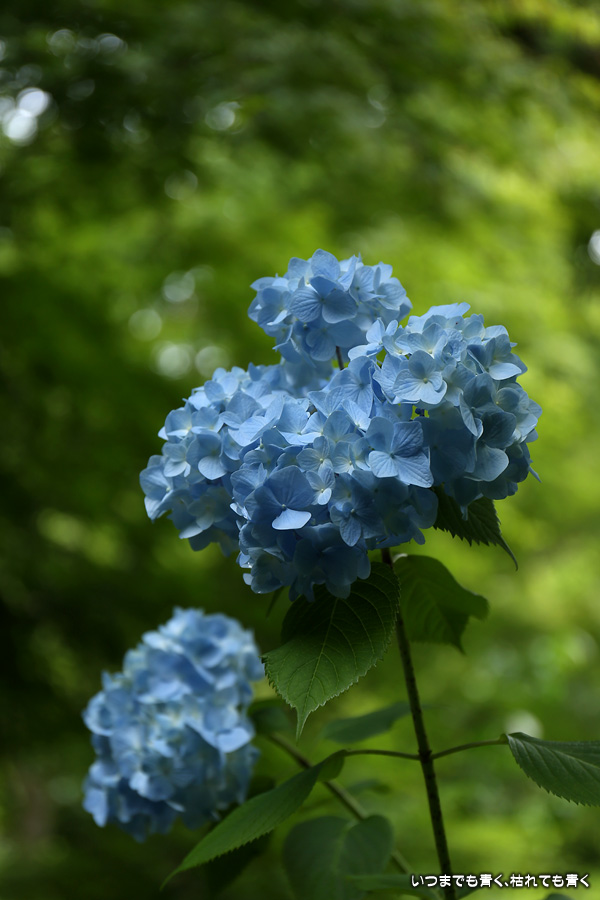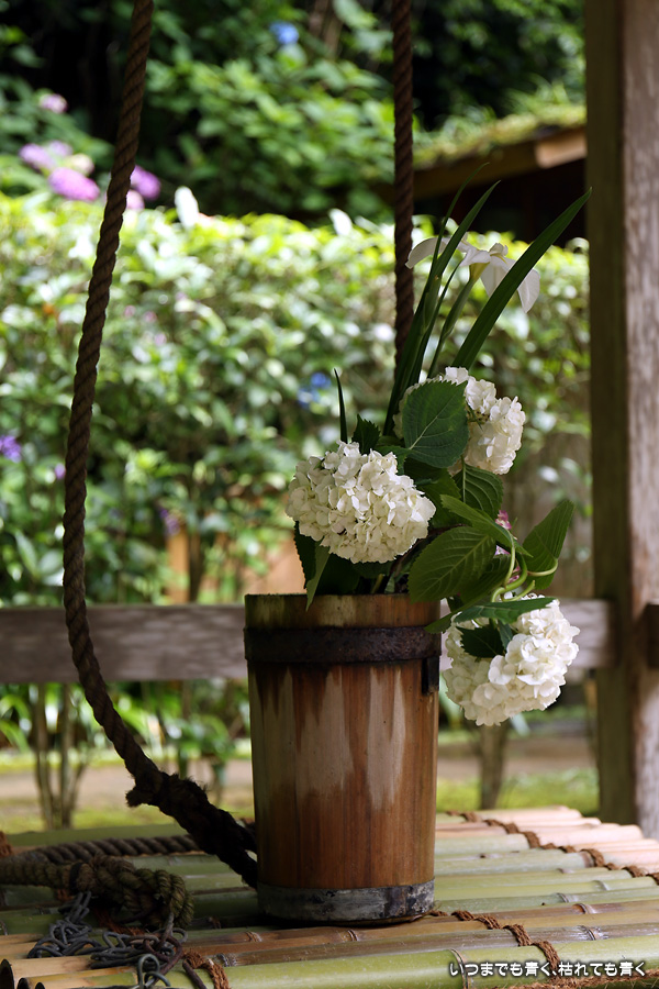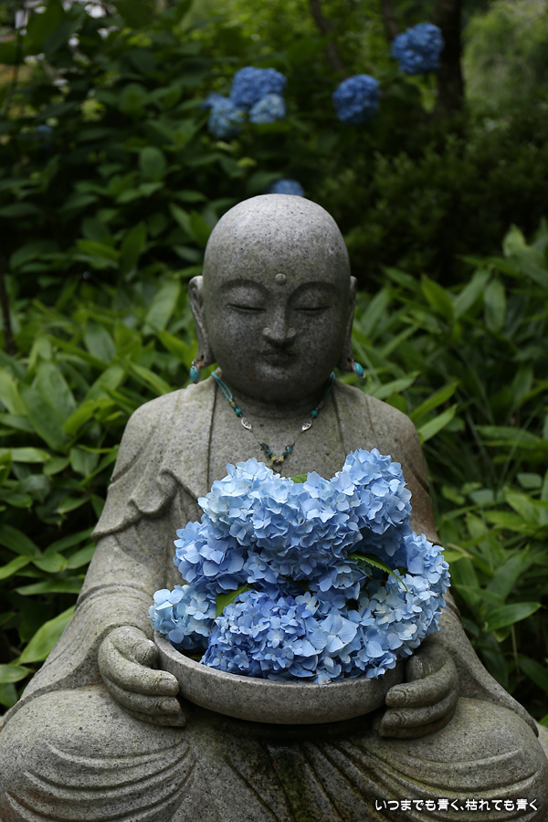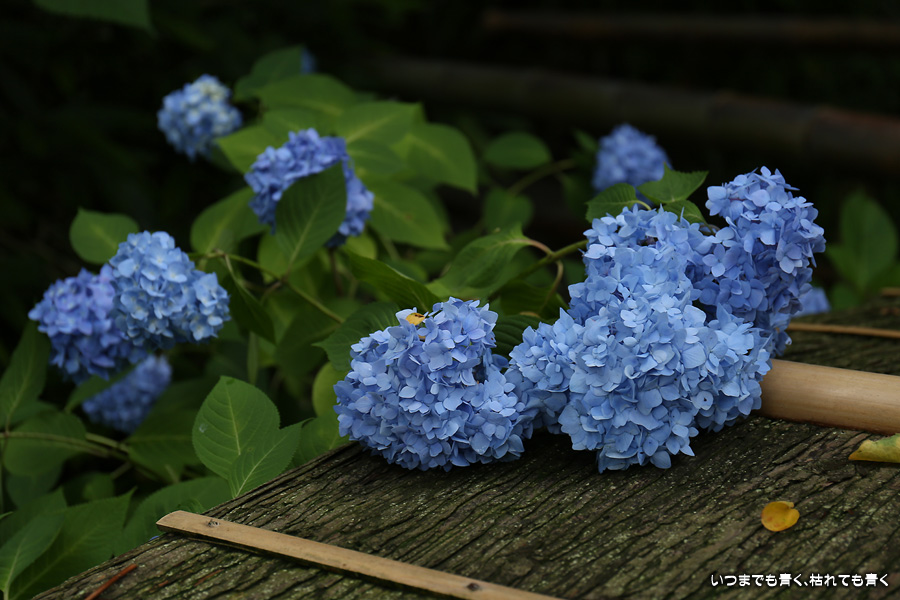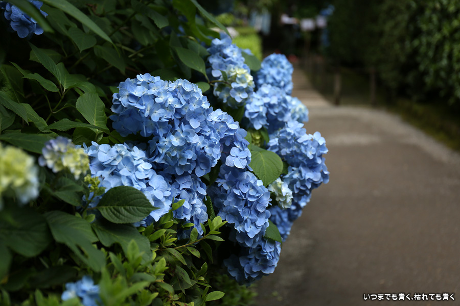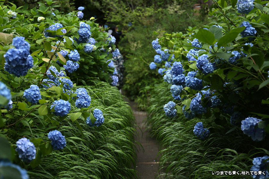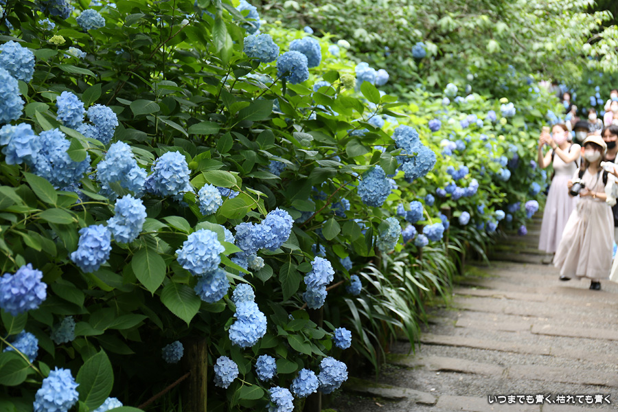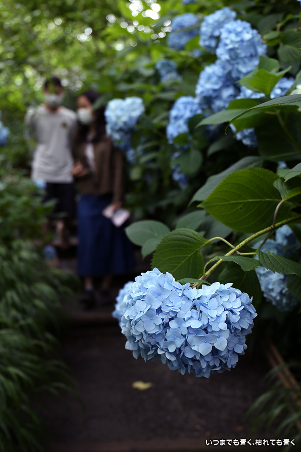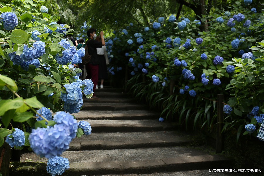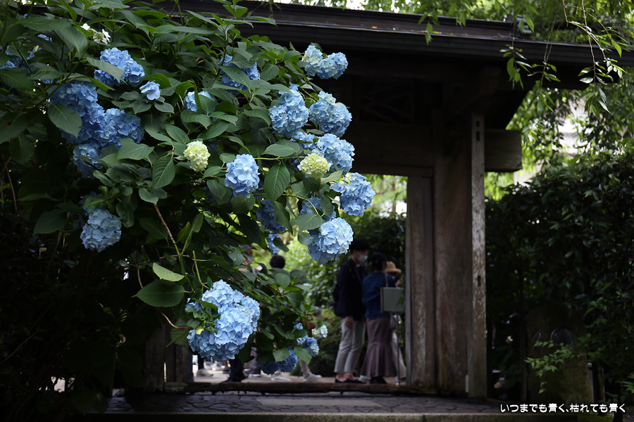 「ここは青い紫陽花ばかりだね」という声がたまに聞こえてきますが、明月院と言えば明月院ブルーの紫陽花です。今年は早めに来たせいか紫陽花の花が若々しくて美しいものばかりでした。明月院ならではの構図で撮影しようと心がけましたが、ひとつひとつの花が美しいので、ついアップで撮ってしまうことも多かったです。人が多くて人を入れない写真を撮るのは難しかったので、人を入れて撮影した写真が多くなりました。