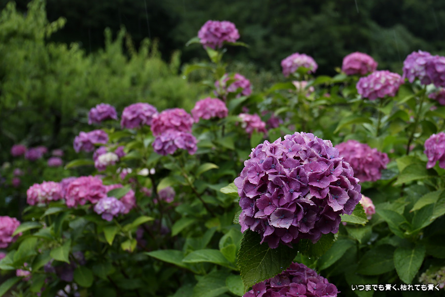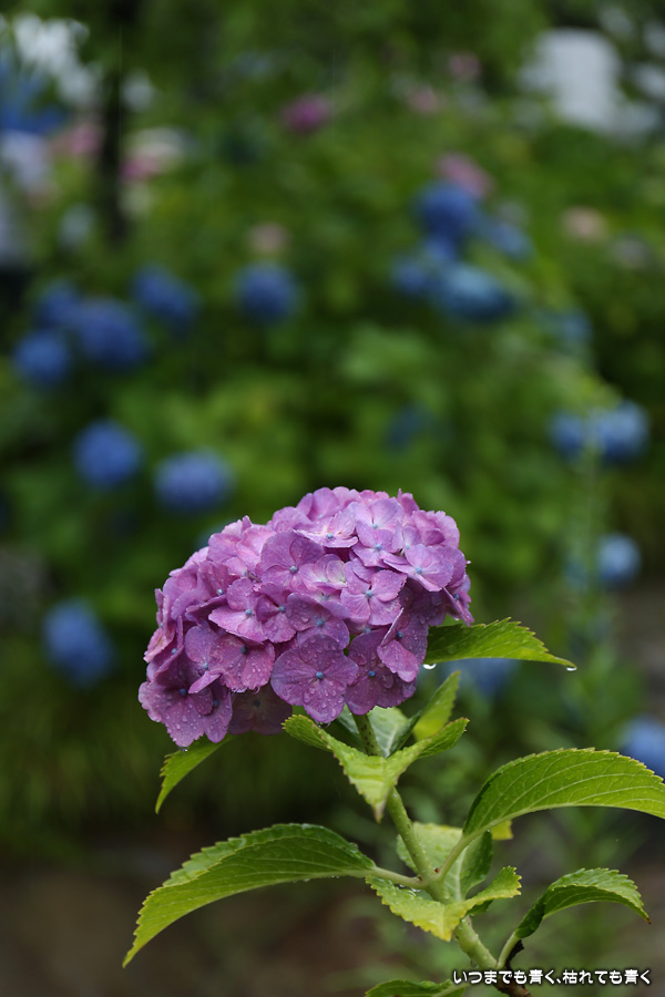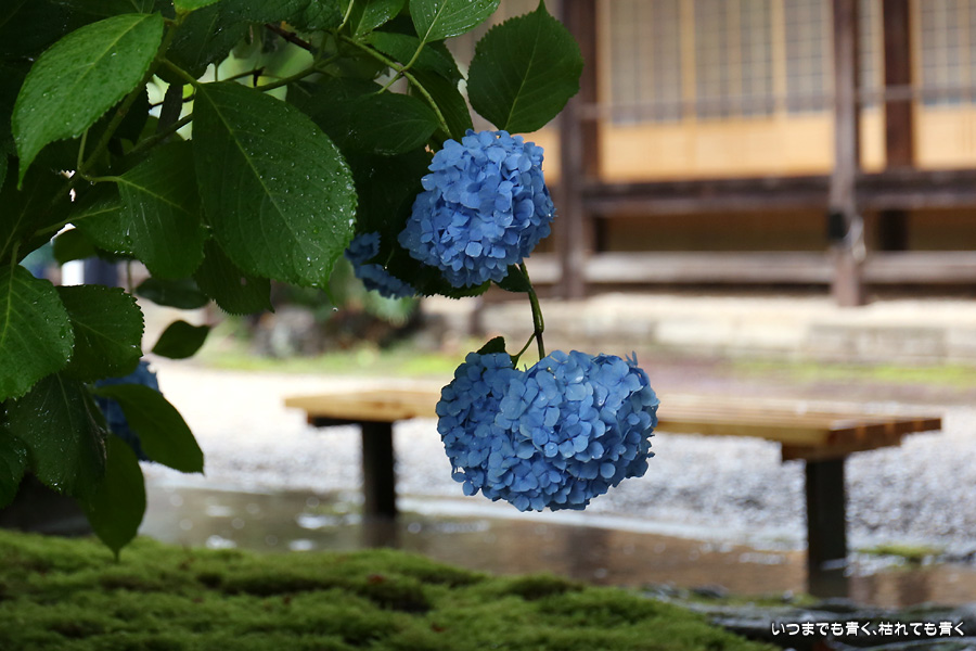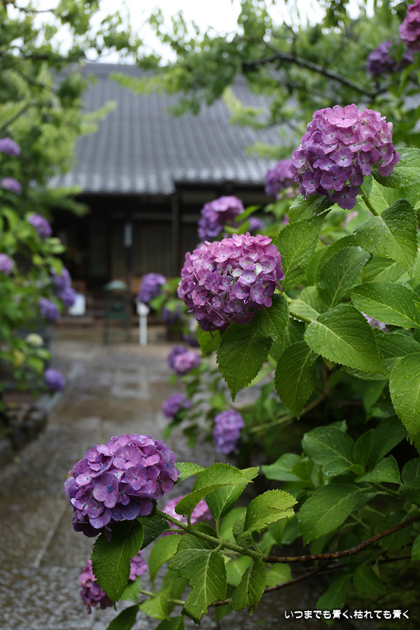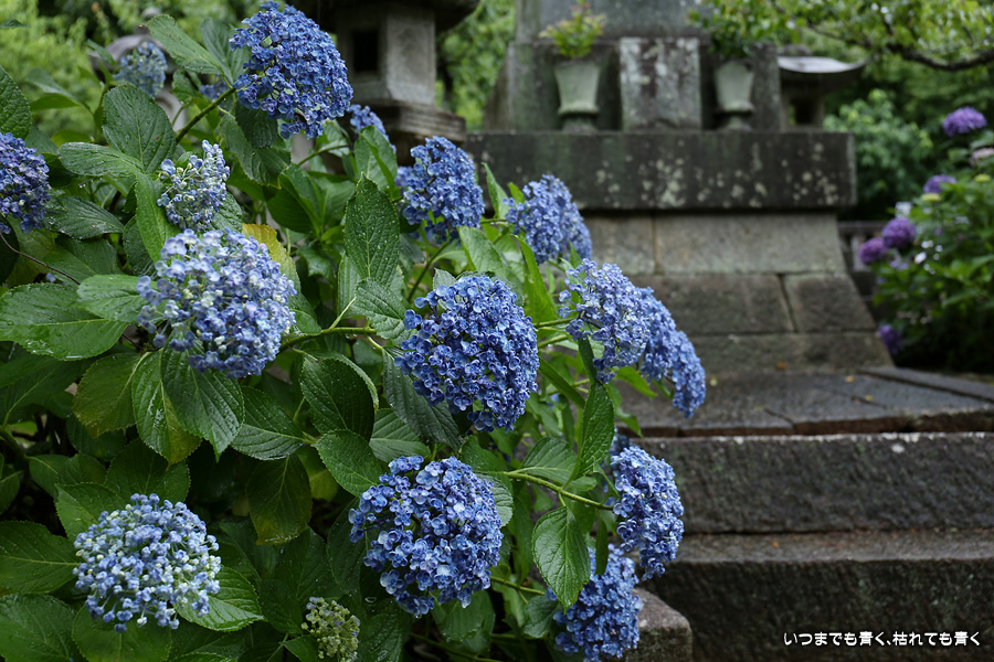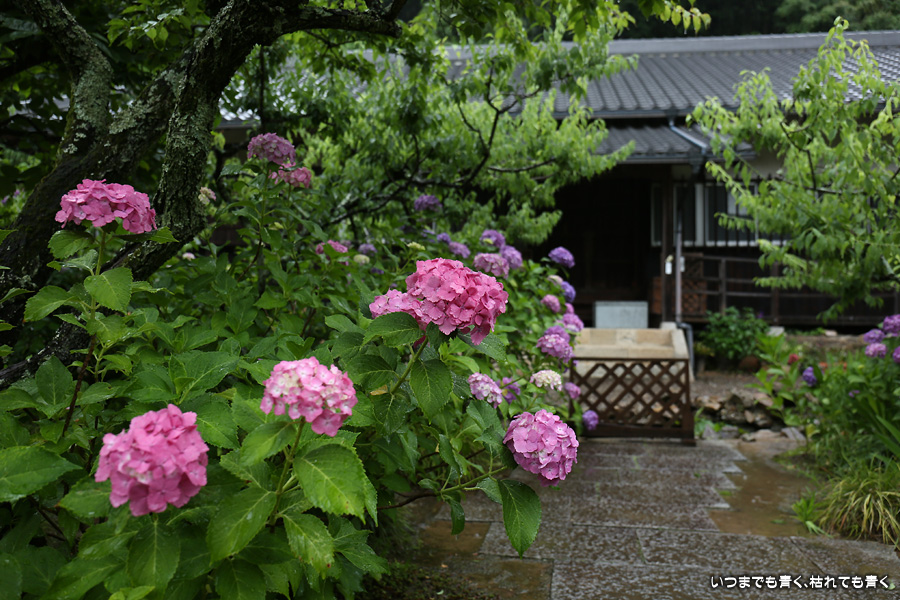御裳神社を出るとすぐに雨が降り出して、本光寺に着いた頃は本降りになっていました。それでも駐車場に入る車の列で訪れる人は多いです。ここの紫陽花は毎年期待を裏切らずいつも美しいですし、いろいろな構図を探すことができます。ただ、本降りの雨の中、傘をさしての撮影でしたので、手ぶれの写真が少なくなく難しい撮影でした。なお、昨年まで工事中だった本堂が3年がかりの改修を終えてきれいになっていました。そのかわりに今度は肖影堂が工事のシートで覆われていました。御朱印をいただくときに「いつ完成ですか?」と尋ねたら、肖影堂は完全な建替え工事なので4年かかるとのことでした。