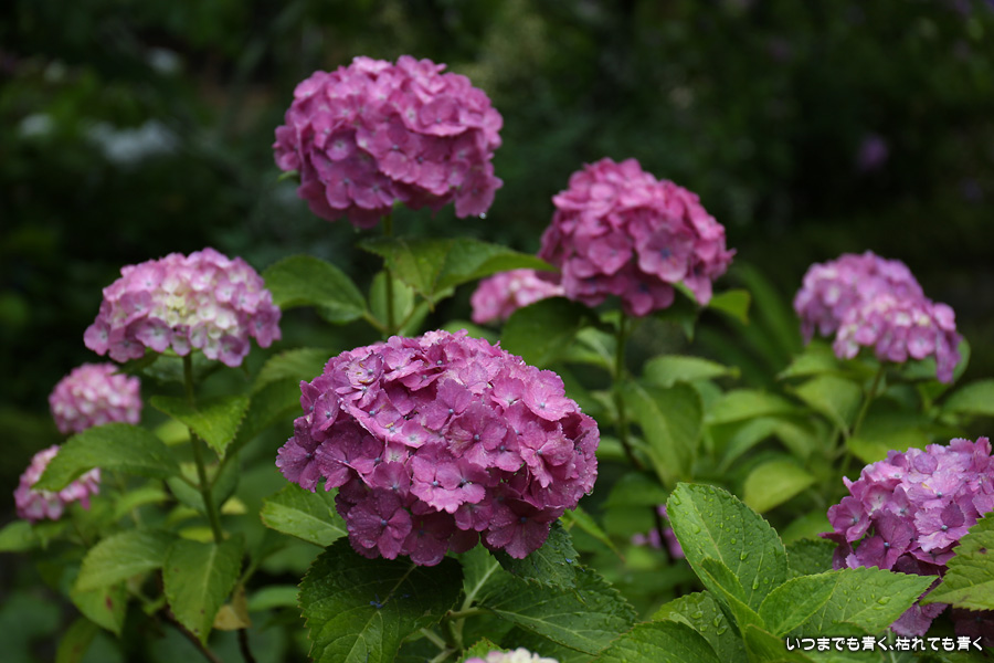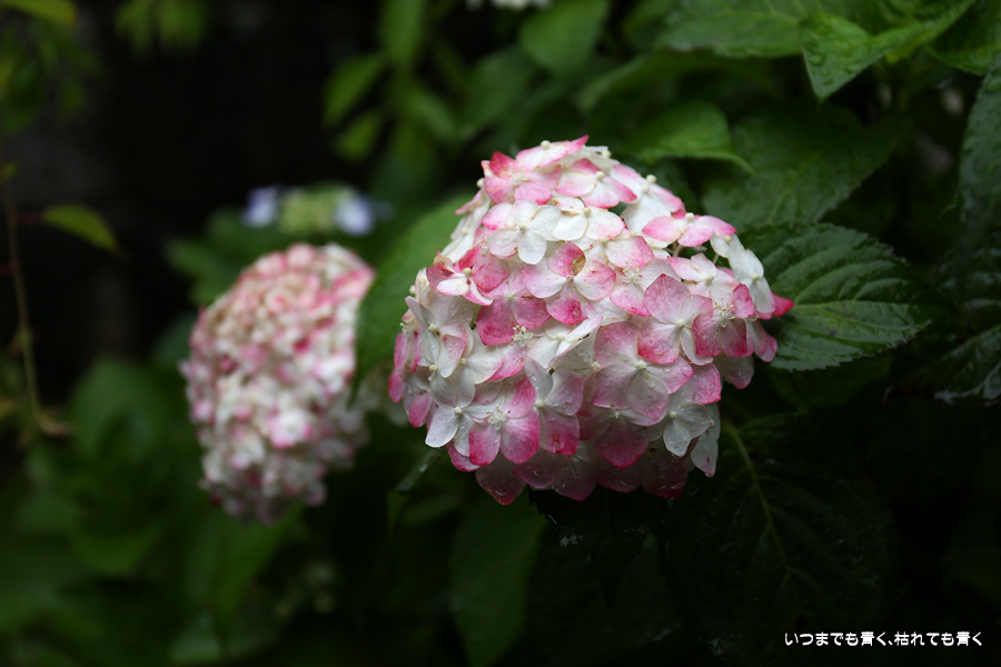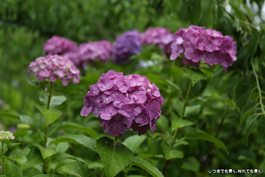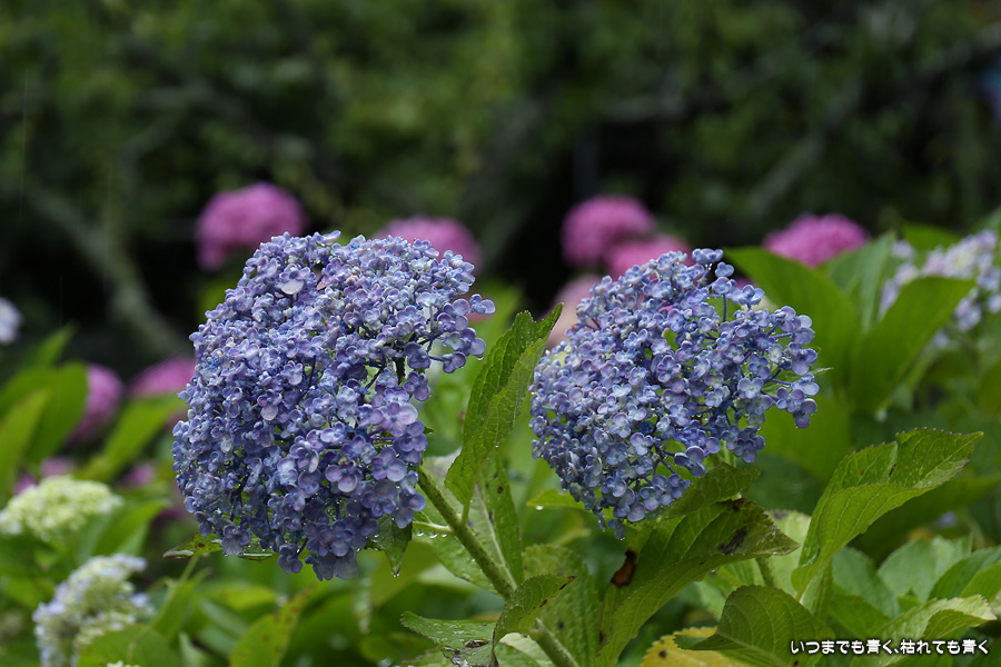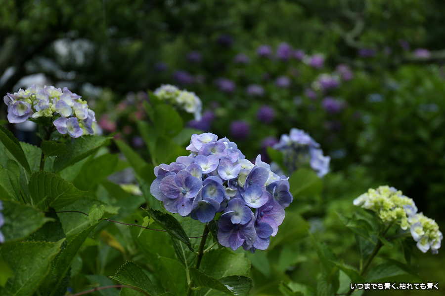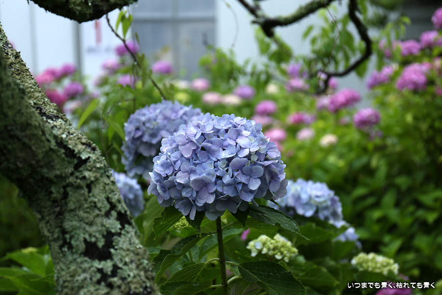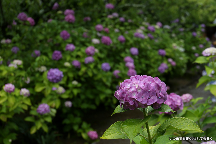 御裳神社を出るとすぐに雨が降り出して、本光寺に着いた頃は本降りになっていました。それでも駐車場に入る車の列で訪れる人は多いです。ここの紫陽花は毎年期待を裏切らずいつも美しいですし、いろいろな構図を探すことができます。ただ、本降りの雨の中、傘をさしての撮影でしたので、手ぶれの写真が少なくなく難しい撮影でした。なお、昨年まで工事中だった本堂が3年がかりの改修を終えてきれいになっていました。そのかわりに今度は肖影堂が工事のシートで覆われていました。御朱印をいただくときに「いつ完成ですか?」と尋ねたら、肖影堂は完全な建替え工事なので4年かかるとのことでした。