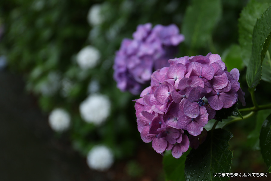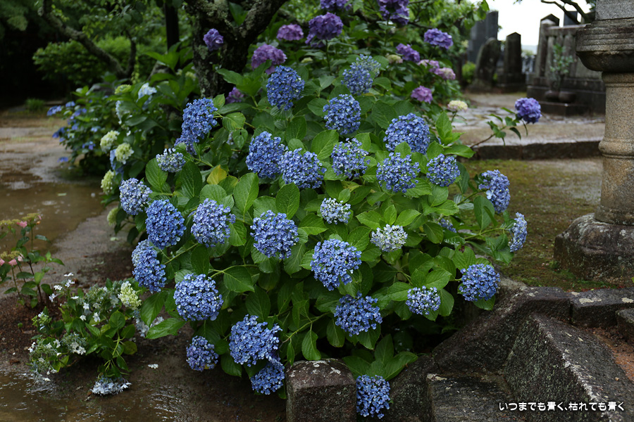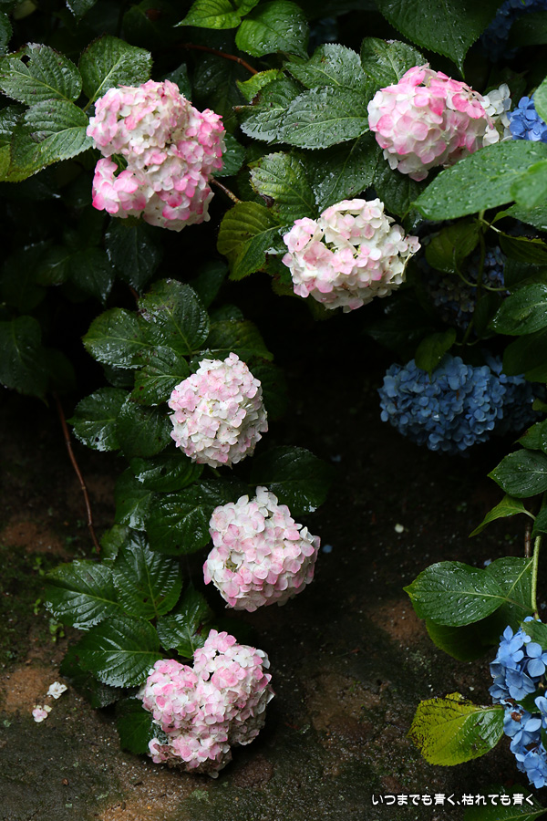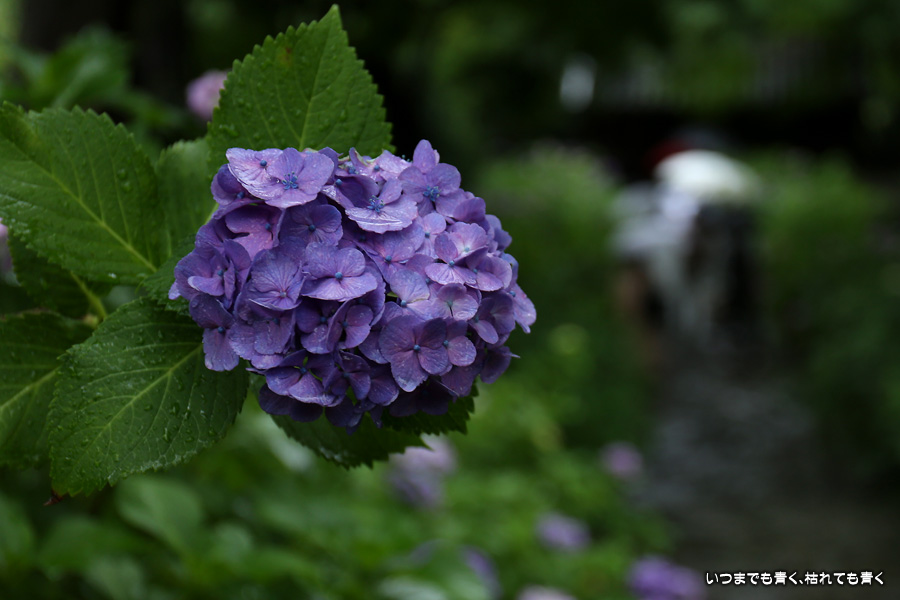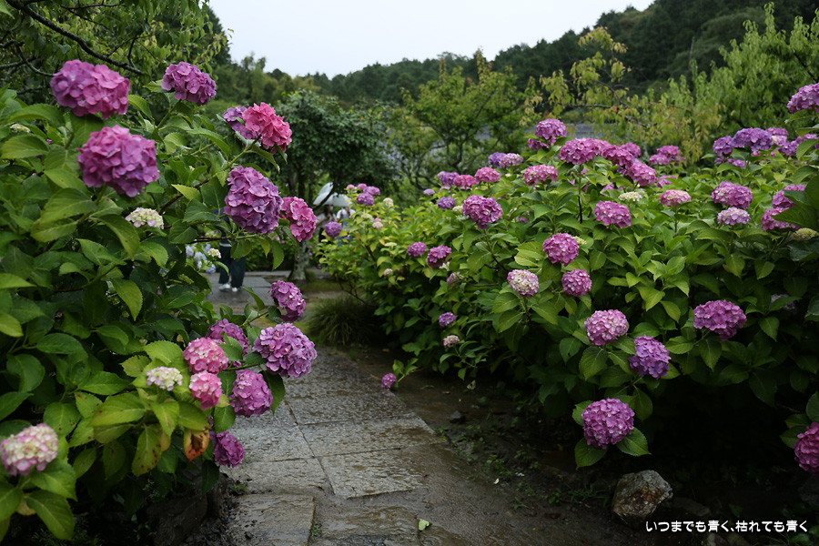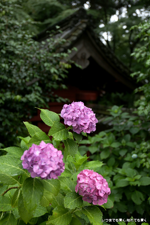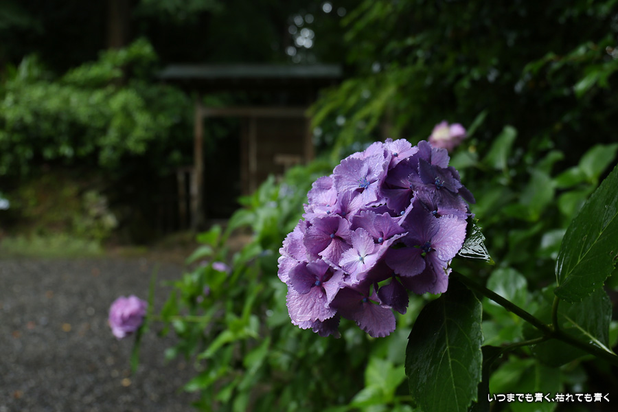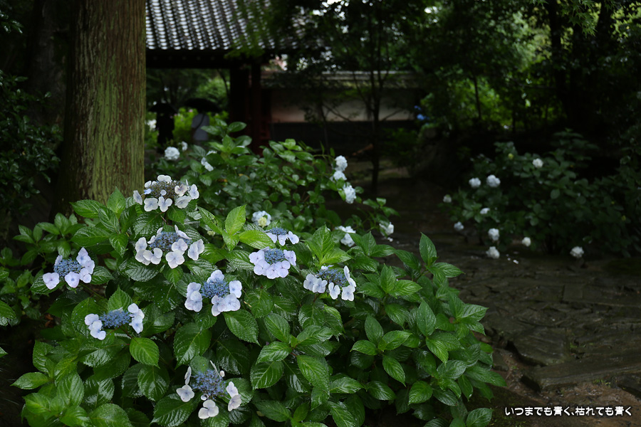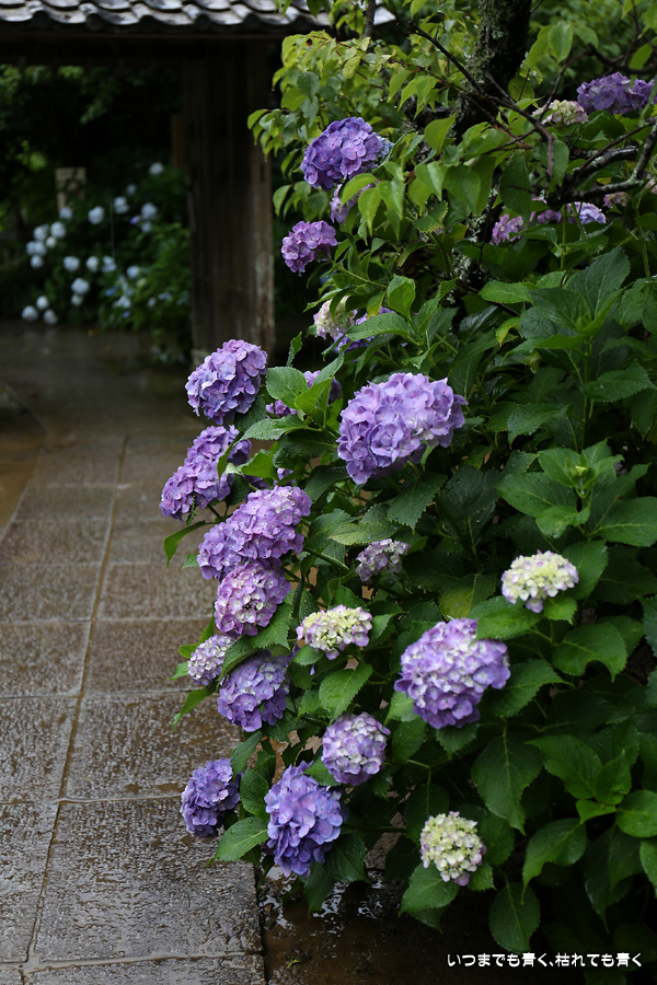 御裳神社を出るとすぐに雨が降り出して、本光寺に着いた頃は本降りになっていました。それでも駐車場に入る車の列で訪れる人は多いです。ここの紫陽花は毎年期待を裏切らずいつも美しいですし、いろいろな構図を探すことができます。ただ、本降りの雨の中、傘をさしての撮影でしたので、手ぶれの写真が少なくなく難しい撮影でした。なお、昨年まで工事中だった本堂が3年がかりの改修を終えてきれいになっていました。そのかわりに今度は肖影堂が工事のシートで覆われていました。御朱印をいただくときに「いつ完成ですか?」と尋ねたら、肖影堂は完全な建替え工事なので4年かかるとのことでした。