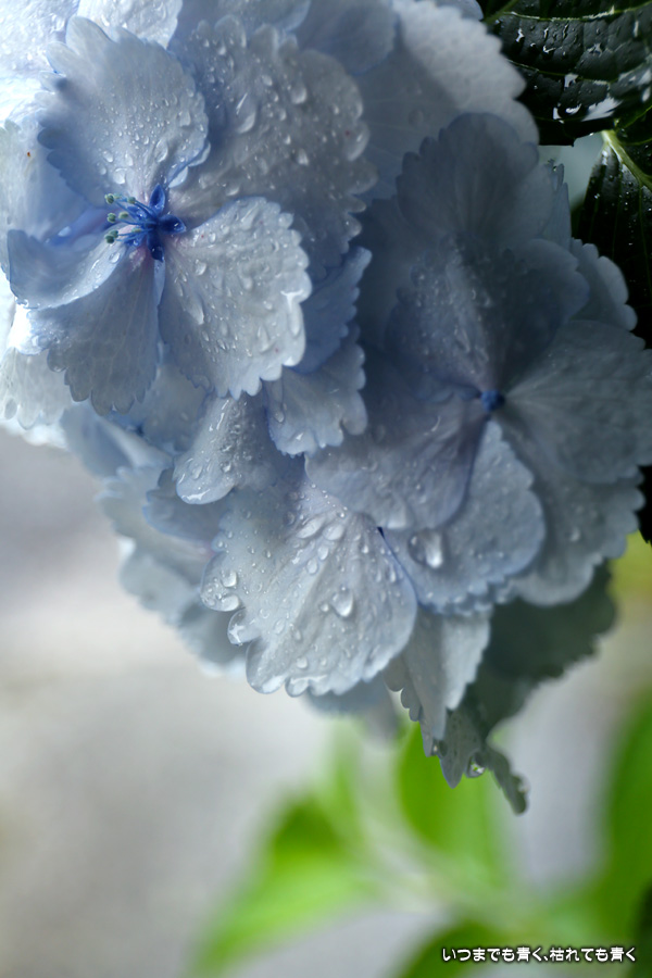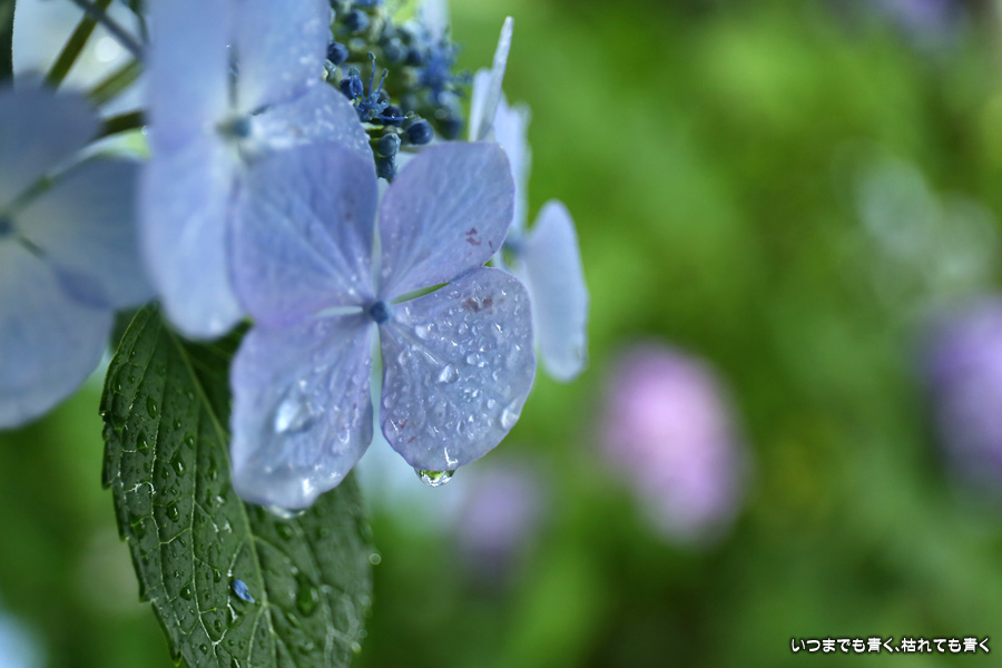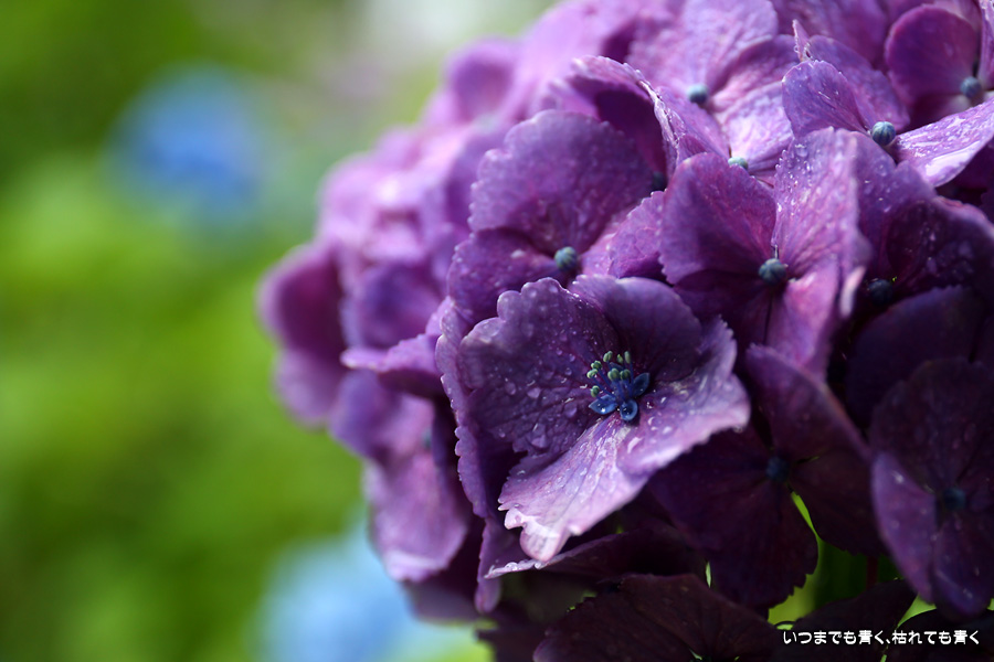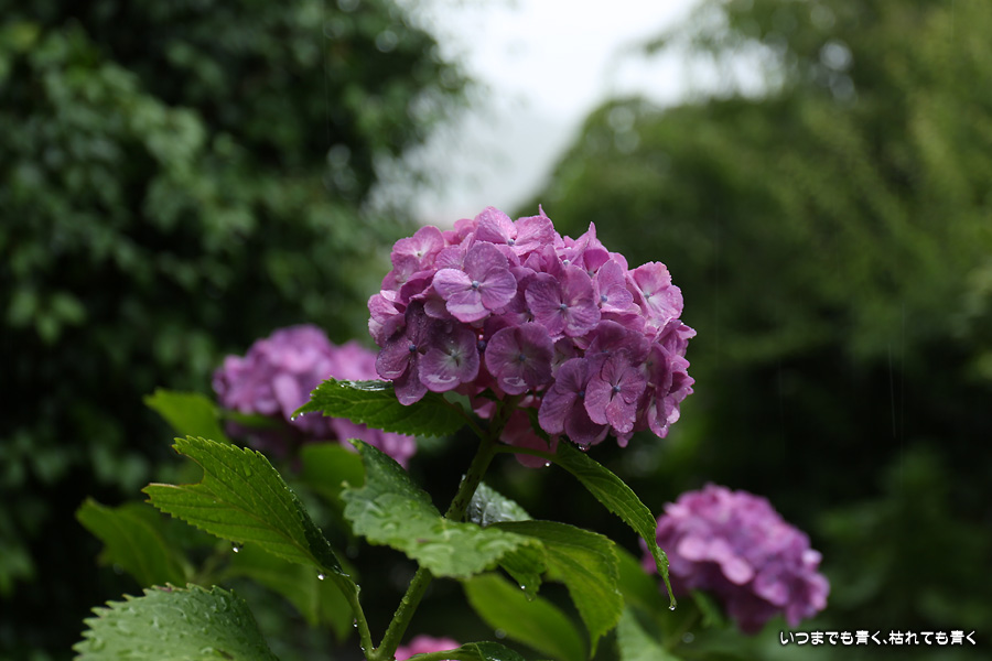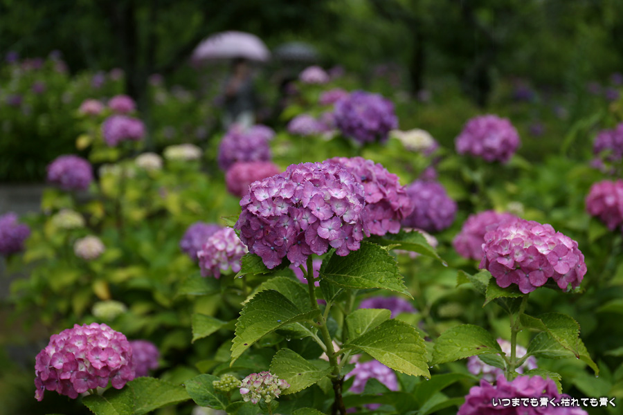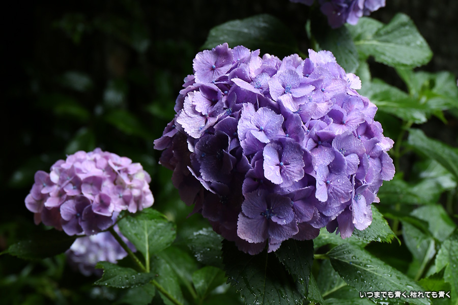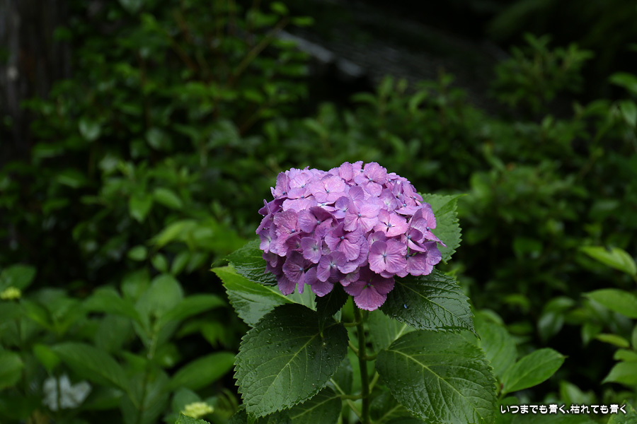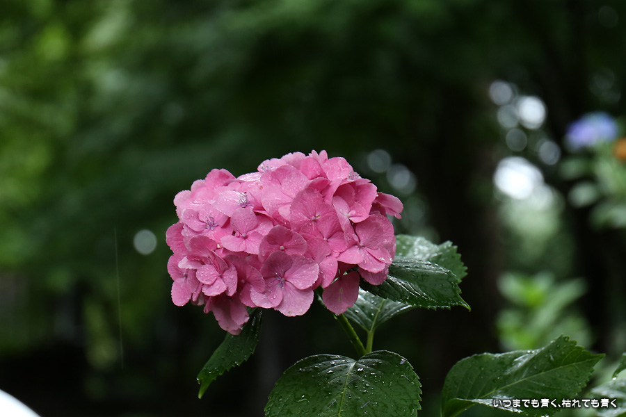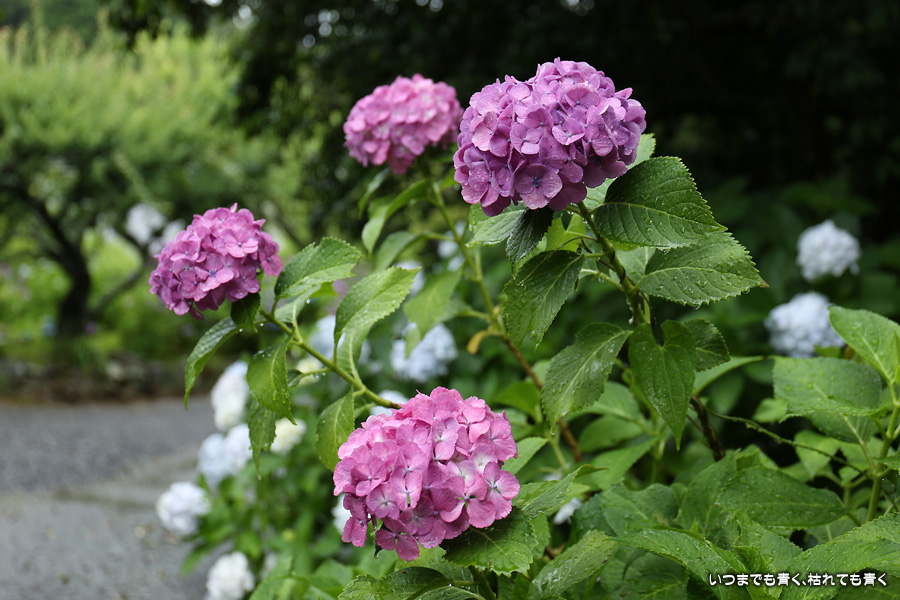 御裳神社を出るとすぐに雨が降り出して、本光寺に着いた頃は本降りになっていました。それでも駐車場に入る車の列で訪れる人は多いです。ここの紫陽花は毎年期待を裏切らずいつも美しいですし、いろいろな構図を探すことができます。ただ、本降りの雨の中、傘をさしての撮影でしたので、手ぶれの写真が少なくなく難しい撮影でした。なお、昨年まで工事中だった本堂が3年がかりの改修を終えてきれいになっていました。そのかわりに今度は肖影堂が工事のシートで覆われていました。御朱印をいただくときに「いつ完成ですか?」と尋ねたら、肖影堂は完全な建替え工事なので4年かかるとのことでした。