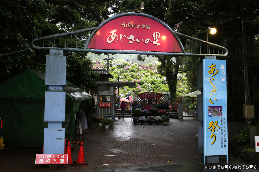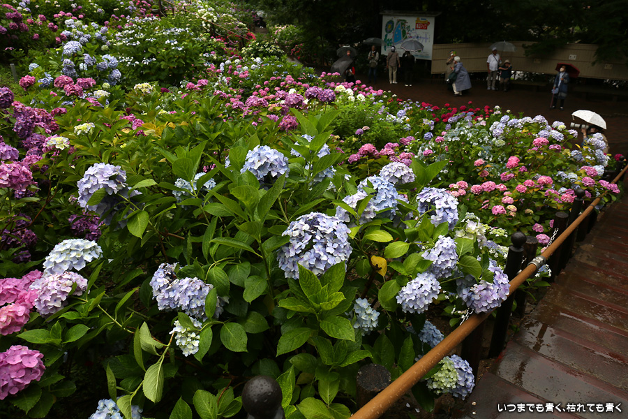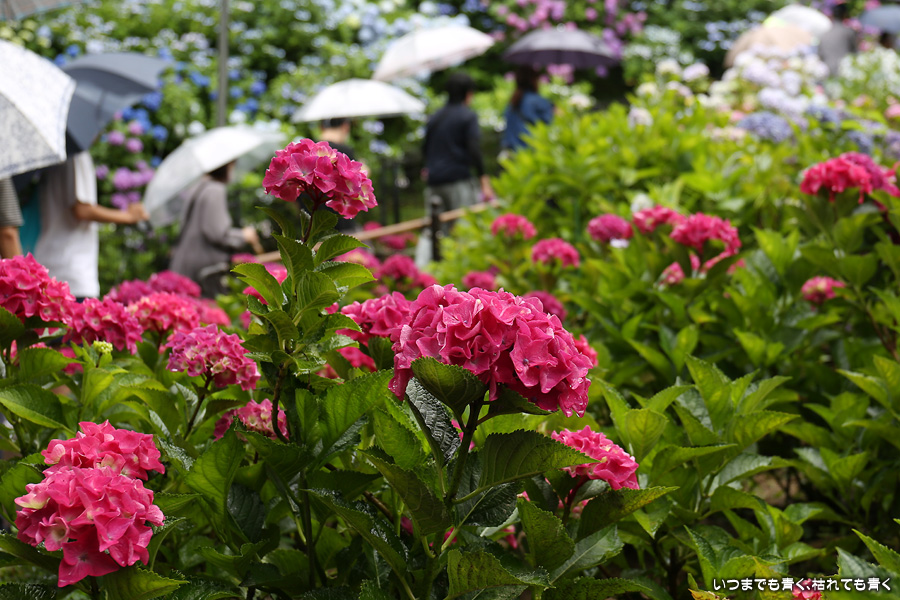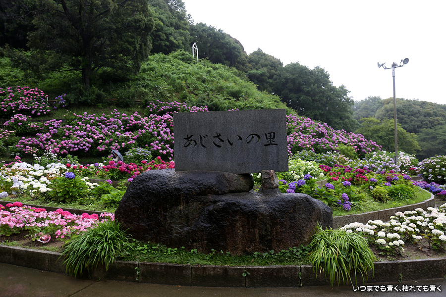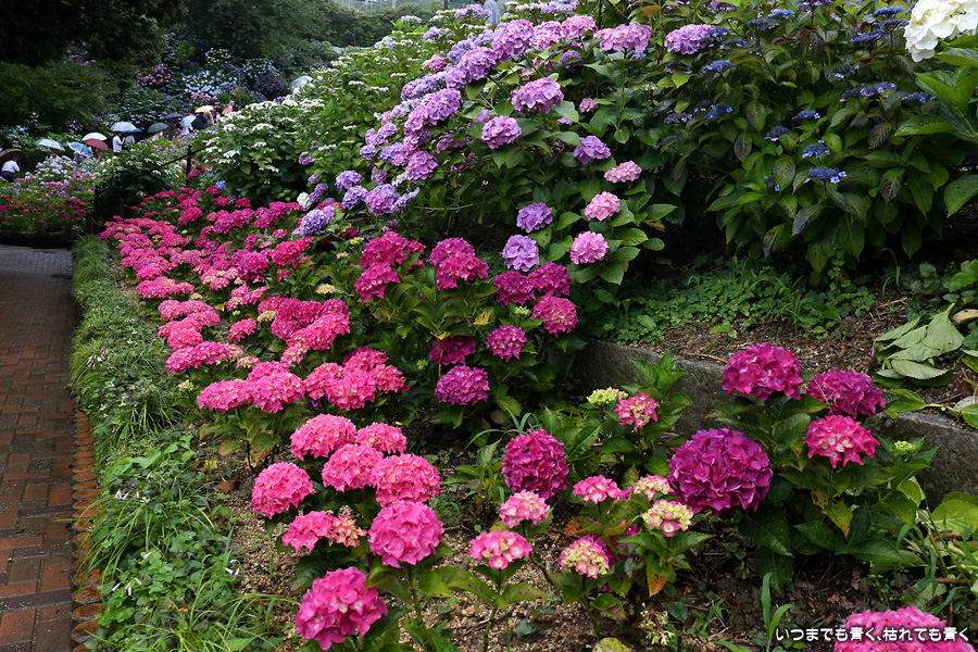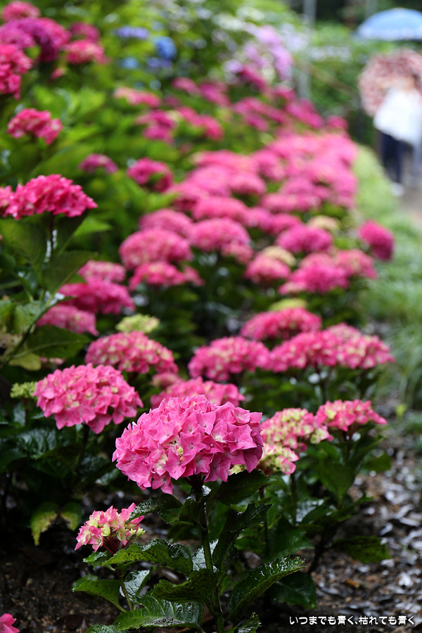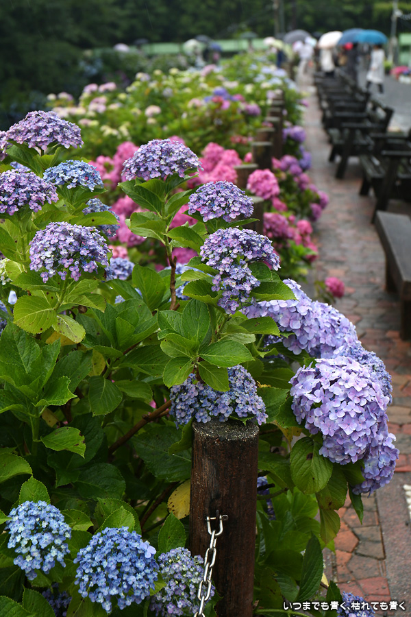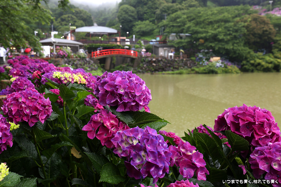 形原温泉あじさいの里は、愛知県では有名な紫陽花の名所なのですが、紫陽花は多くても味気がないだろうと勝手に思っていて訪れることがなかったところです。なので、今回が初めての訪問となります。雨が降っていて紫陽花にはいい感じでしたが、望遠レンズを持ち込むことは難しく、傘をさしての標準ズームレンズでの撮影となりました。形原温泉あじさいの里は、思っていた以上に絵になる素敵なところでした。起伏在り、池あり、橋あり、丘ありの地形にいろんな種類、いろんな色の紫陽花が植えられていて、広い園内を退屈することなく時間を忘れて楽しむことができました。