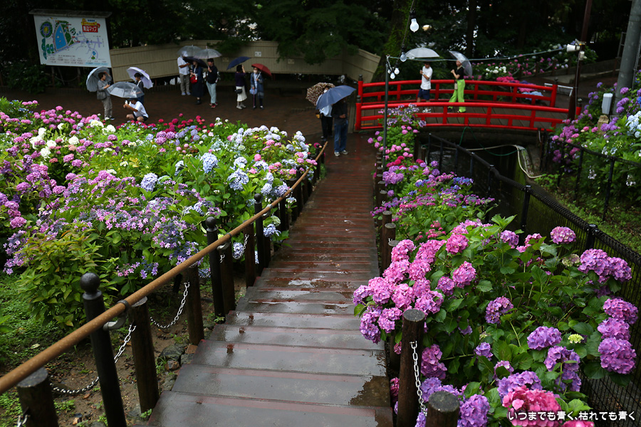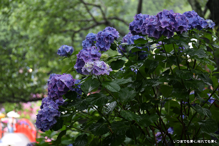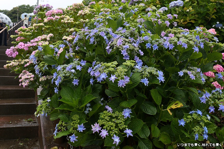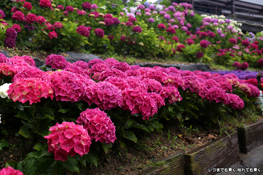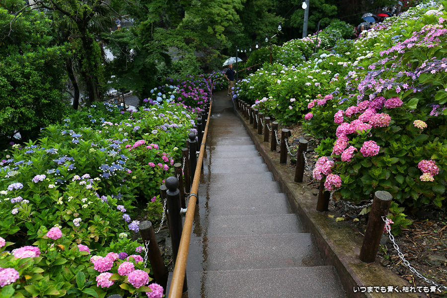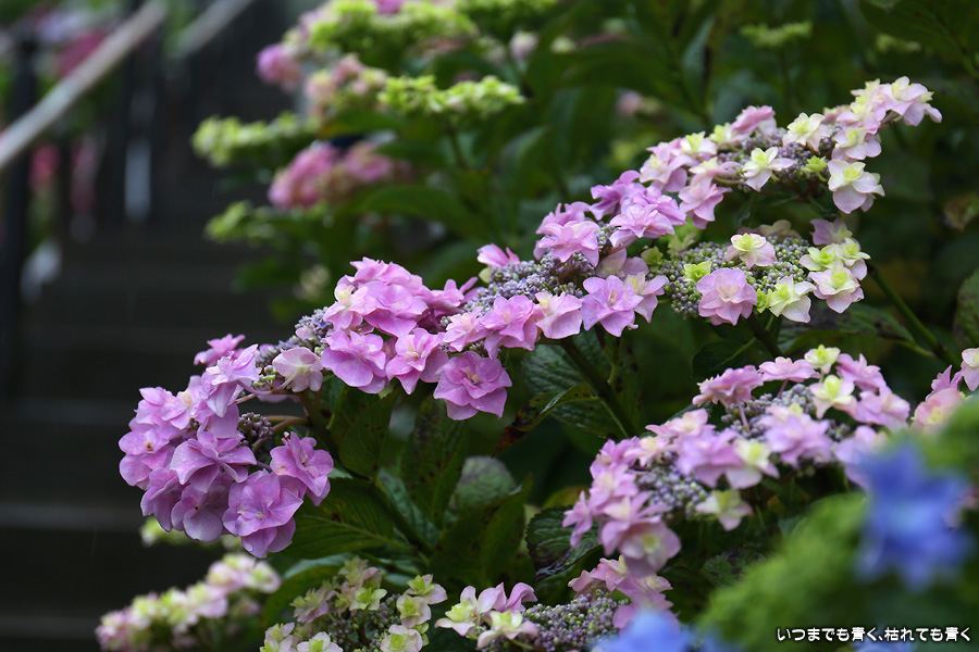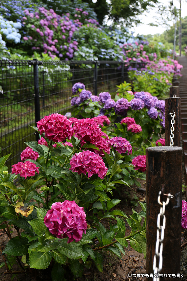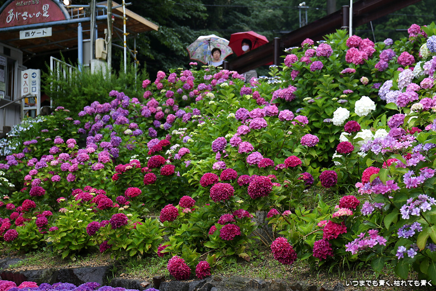 形原温泉あじさいの里は、愛知県では有名な紫陽花の名所なのですが、紫陽花は多くても味気がないだろうと勝手に思っていて訪れることがなかったところです。なので、今回が初めての訪問となります。雨が降っていて紫陽花にはいい感じでしたが、望遠レンズを持ち込むことは難しく、傘をさしての標準ズームレンズでの撮影となりました。形原温泉あじさいの里は、思っていた以上に絵になる素敵なところでした。起伏在り、池あり、橋あり、丘ありの地形にいろんな種類、いろんな色の紫陽花が植えられていて、広い園内を退屈することなく時間を忘れて楽しむことができました。