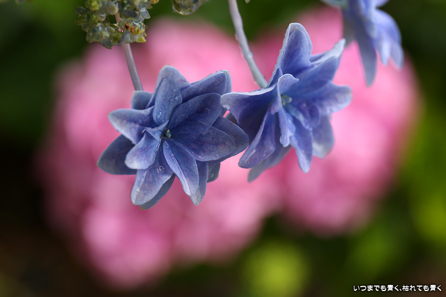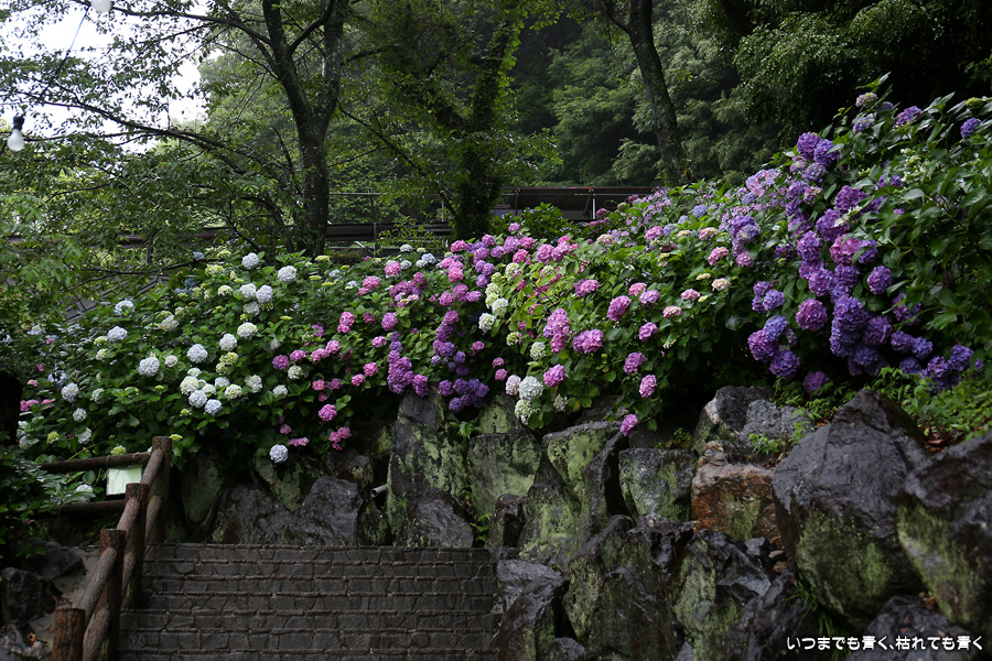 形原温泉あじさいの里は、愛知県では有名な紫陽花の名所なのですが、紫陽花は多くても味気がないだろうと勝手に思っていて訪れることがなかったところです。なので、今回が初めての訪問となります。雨が降っていて紫陽花にはいい感じでしたが、望遠レンズを持ち込むことは難しく、傘をさしての標準ズームレンズでの撮影となりました。形原温泉あじさいの里は、思っていた以上に絵になる素敵なところでした。起伏在り、池あり、橋あり、丘ありの地形にいろんな種類、いろんな色の紫陽花が植えられていて、広い園内を退屈することなく時間を忘れて楽しむことができました。