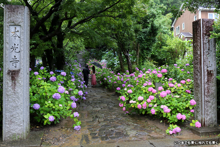 形原温泉あじさいの里の帰りに雨の本光寺の紫陽花も見たくて立ち寄りました。雨の日の撮影は大変ですが、紫陽花は雨の日のほうが美しく写真におさめることができたと思います。ひととおり撮影した後にもう一度境内に戻ろうとした時にアクシデントがありました。団体の大勢のおばちゃんを追い抜こうとして石畳からぬかるみに足を置いた瞬間、滑って転んで尻もちをついてしまいました。おばちゃんたち、「大丈夫?」と心配してくださるので「服はよごれましたが大丈夫です!」と言ってお礼を言って立ち去りましたが、お尻は泥だらけになり、膝を捻って少し痛めてしまいました。無理に追い越そうとしたこと、靴が古くなって滑りやすくなっていたことが良くなかったです。大怪我しなくて良かったです。
