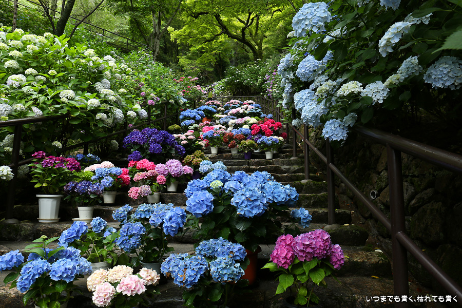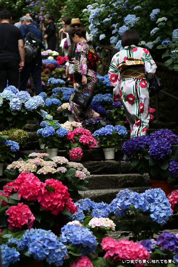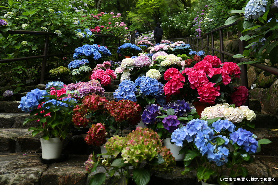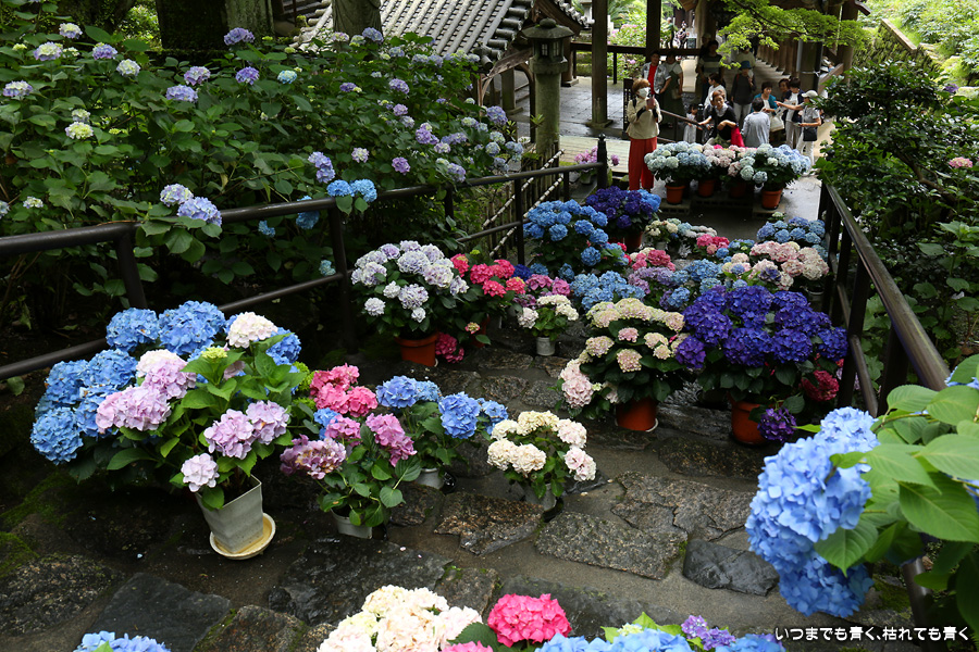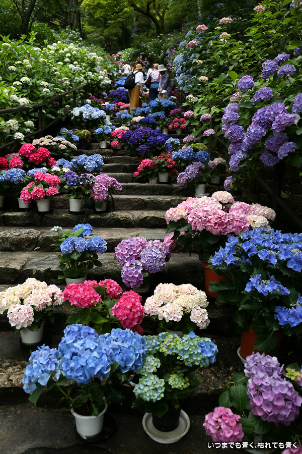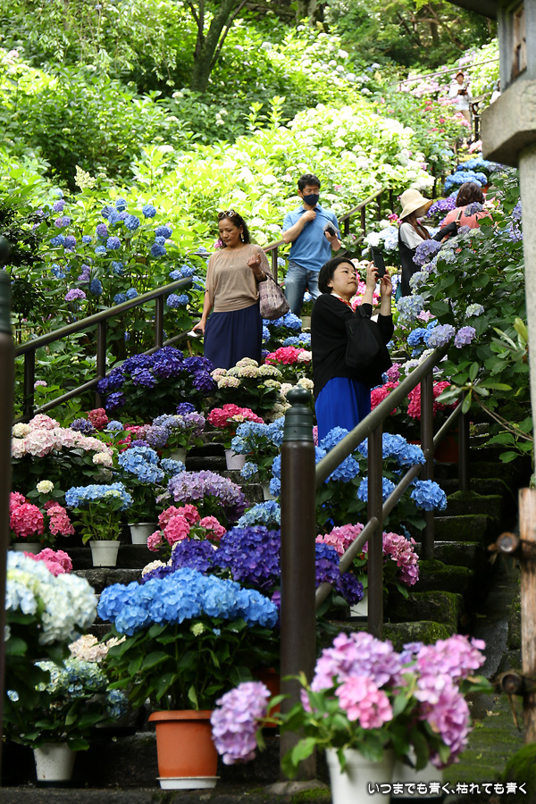 長谷寺の嵐の坂に紫陽花の鉢植えがびっしりと飾られています。大和三大観音である長谷寺、岡寺、壷阪寺でおこなわれている「あぢさゐ回廊」です。いろんな色の鮮やかな紫陽花はとれも美しいです。嵐の坂は立ち入り禁止にもなっておらず、この石段を鉢植えを避けて上ったり下りたりできます。写真を撮るには人が入って邪魔ですが、おかしな雰囲気になることも無く皆さん楽し気に写真を撮っていました。私も人を入れたり、じっと人がいなくなるのを待ったりと、のんびりと楽しみながら写真撮影をしました。岡寺と壷阪寺にも行きたいと思いましたが、それは来年の楽しみになりそうです。