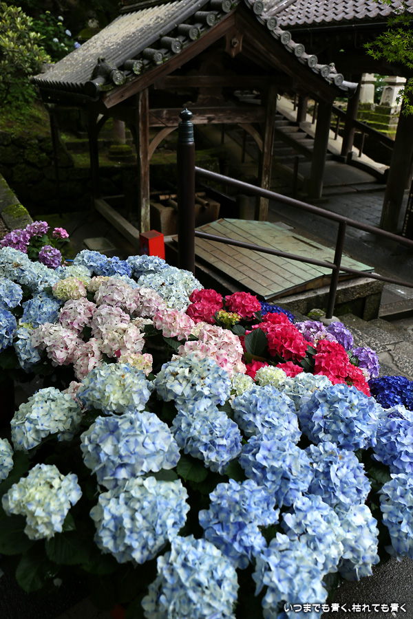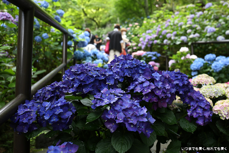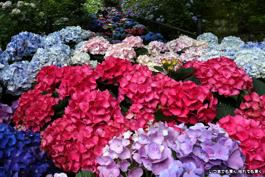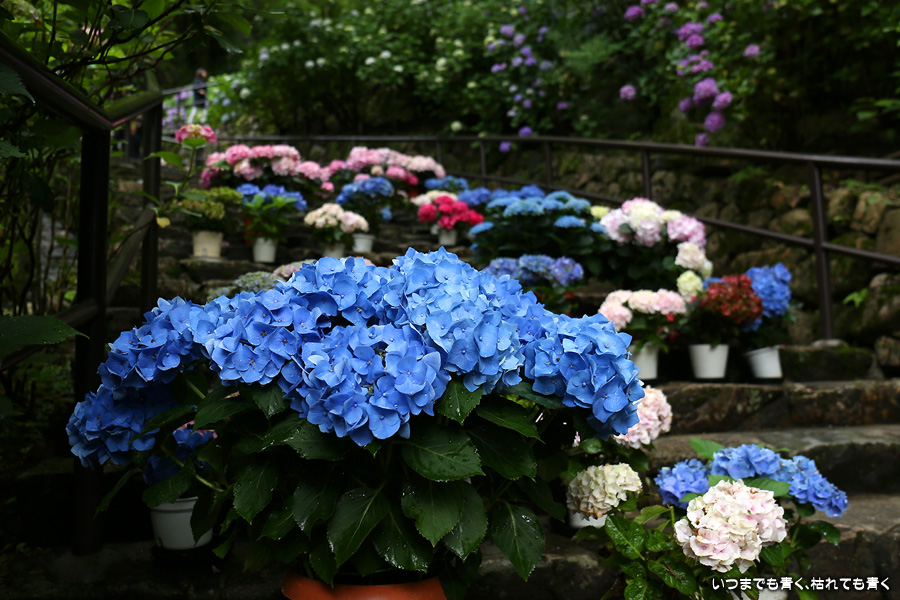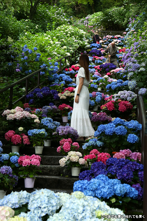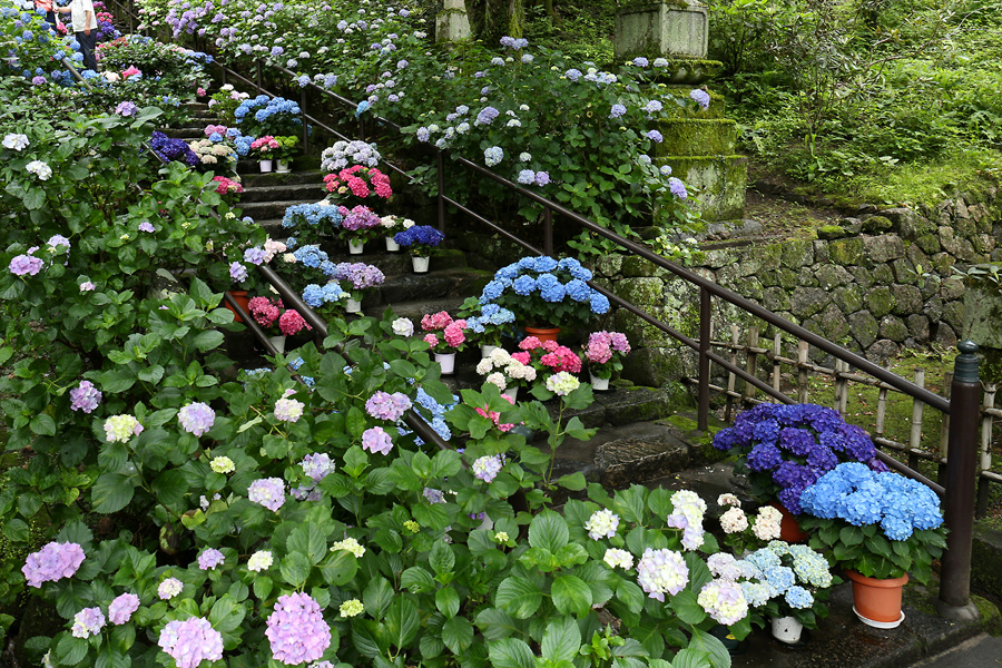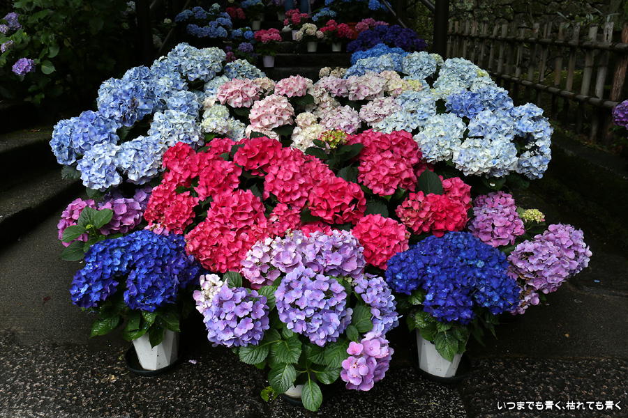 長谷寺の嵐の坂に紫陽花の鉢植えがびっしりと飾られています。大和三大観音である長谷寺、岡寺、壷阪寺でおこなわれている「あぢさゐ回廊」です。いろんな色の鮮やかな紫陽花はとれも美しいです。嵐の坂は立ち入り禁止にもなっておらず、この石段を鉢植えを避けて上ったり下りたりできます。写真を撮るには人が入って邪魔ですが、おかしな雰囲気になることも無く皆さん楽し気に写真を撮っていました。私も人を入れたり、じっと人がいなくなるのを待ったりと、のんびりと楽しみながら写真撮影をしました。岡寺と壷阪寺にも行きたいと思いましたが、それは来年の楽しみになりそうです。