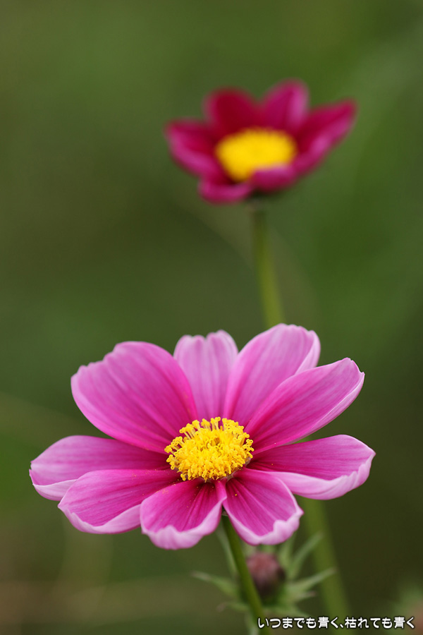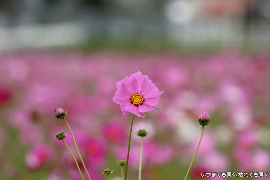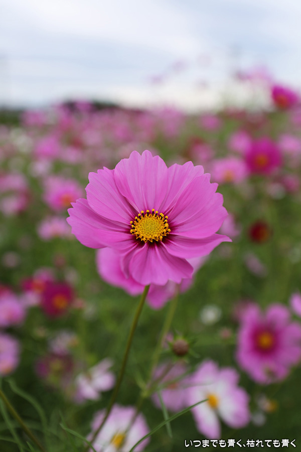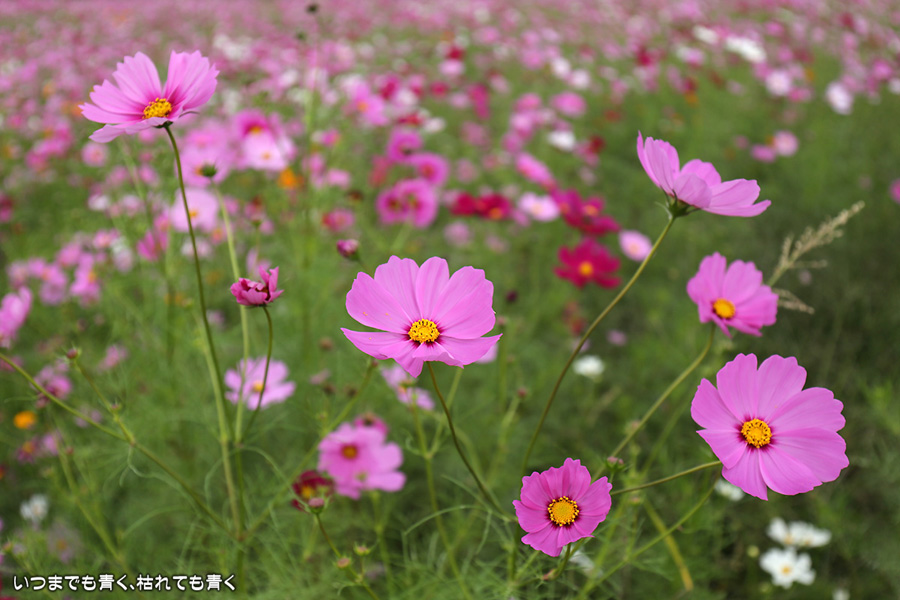 ふたたび訪れた千足町のコスモス畑です。二週間前に訪れた時は、咲いている花が少なくてこれからという感じでしたが、今日は満開で色鮮やかな美しいコスモス畑になっていました。ただ、今日も風が強くて写真撮影には適さなかったのが残念でした。なお、昨夜落としてしまった機材が心配だったので、今日重点的に使ってみましたが、まったく問題ありませんでした。良かったです。
