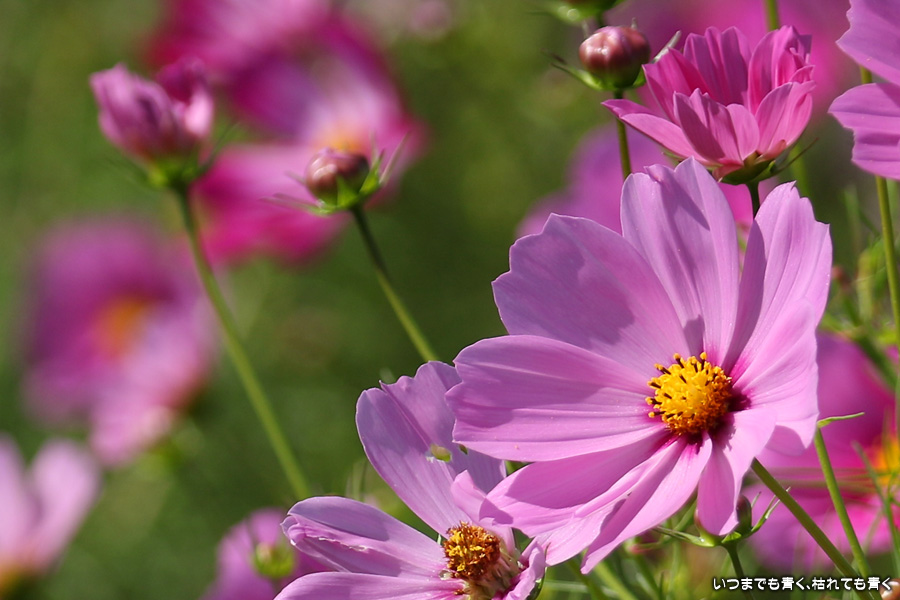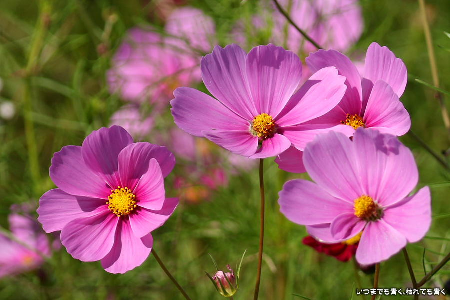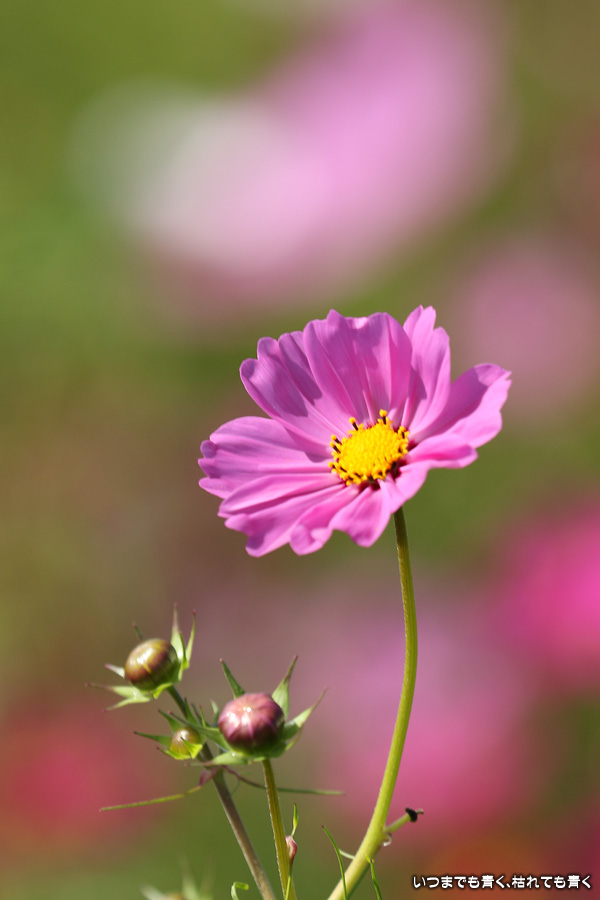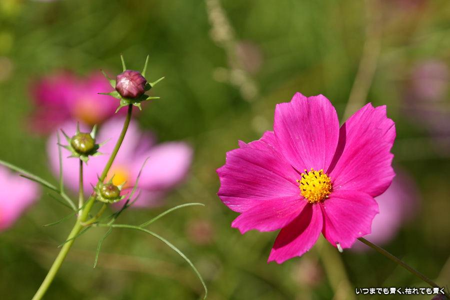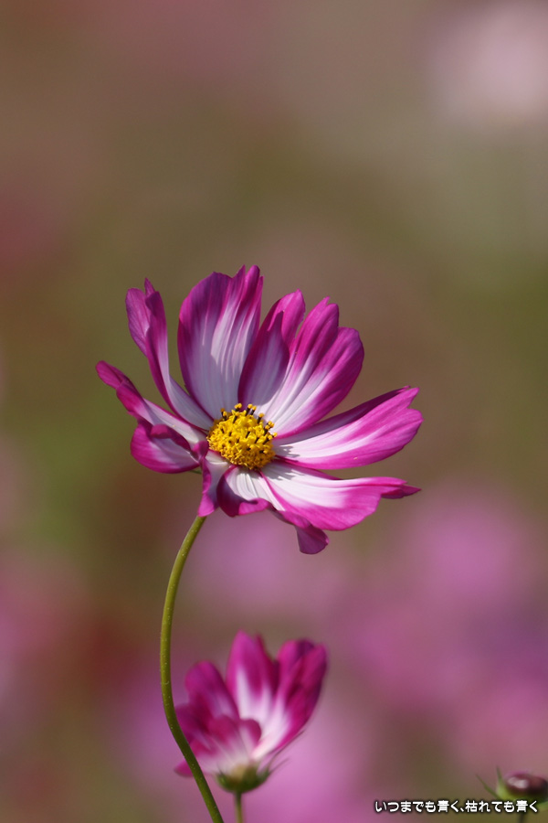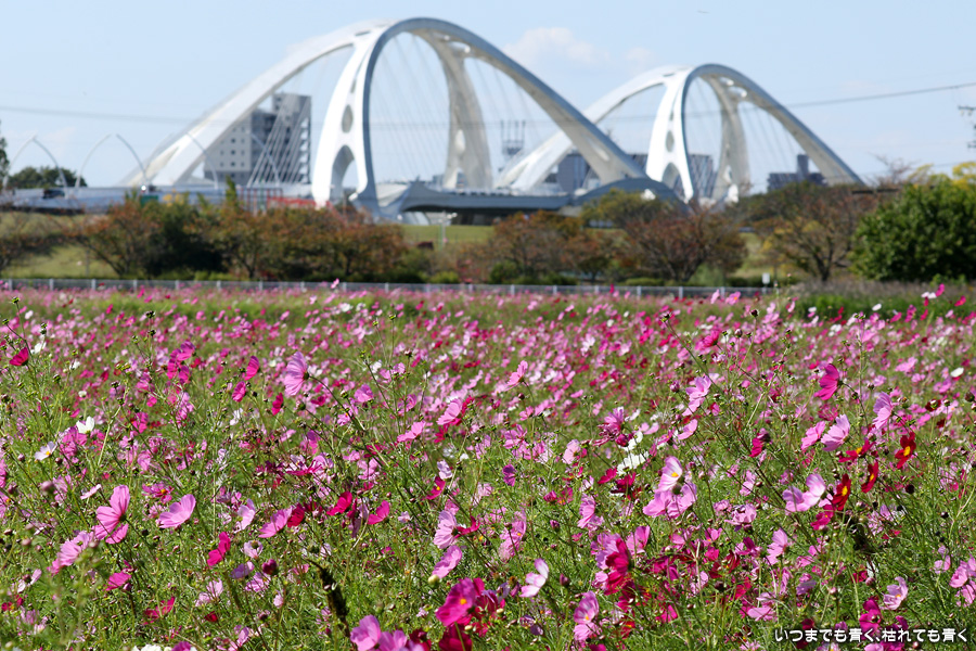 豊田スタジアム周辺の畑のコスモスが美しいと聞いて撮影に訪れました。この日は天気はとても良かったのですが、風がとても強くてすべてのコスモスが右に左に揺れている状態で、コスモスの撮影には条件の良くない日でした。コスモスを見ると秋を感じます。