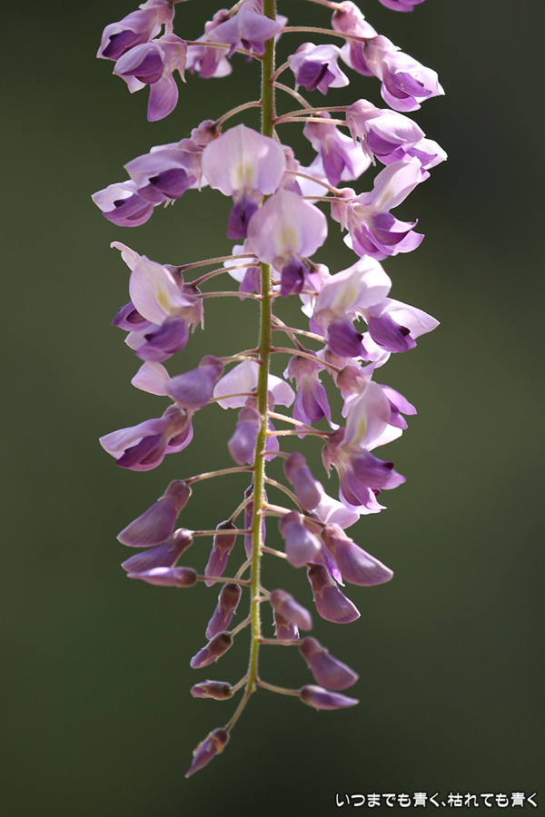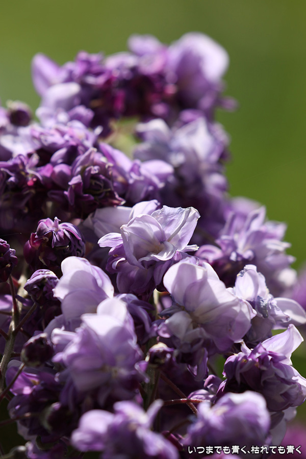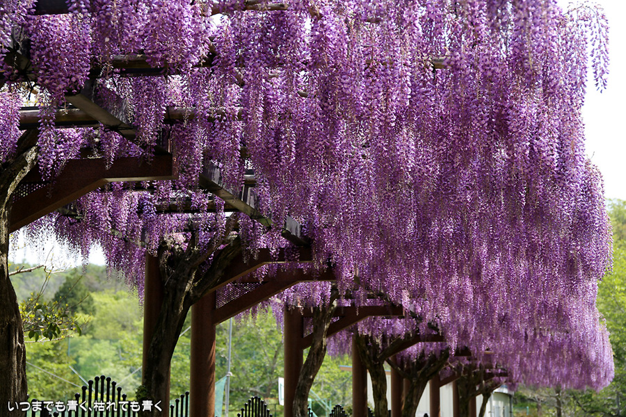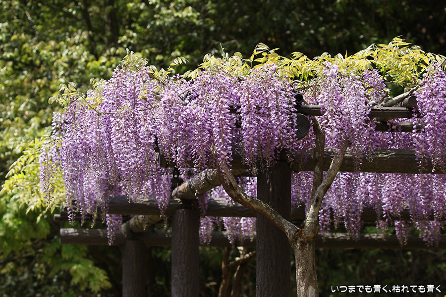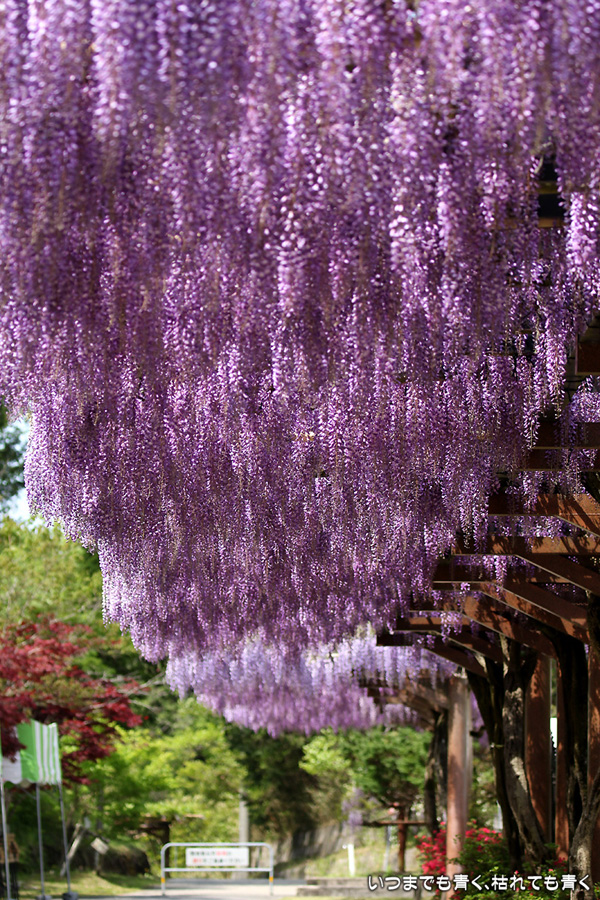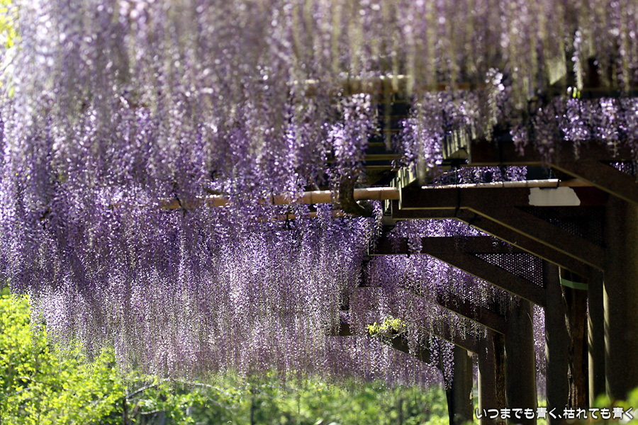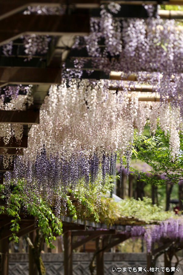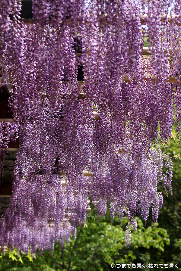 クルマで自宅から1時間弱の市内にある「ふじの回廊」に朝一番で行ってきました。房の先のほうはまだ咲ききっていないのもあり、見頃にはちょっと早いようです。ただ、下が咲く頃は上が枯れ始めていることもありますので、花の美しさからいうと今日くらいがちょうどいいのかも知れません。しかも、今日は人もまばらで、ゆっくりと写真を撮ることができました。ちなみに5/3〜5に「ふじまつり」が開催されます。
