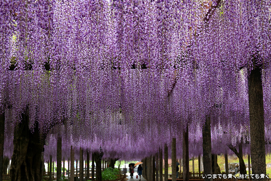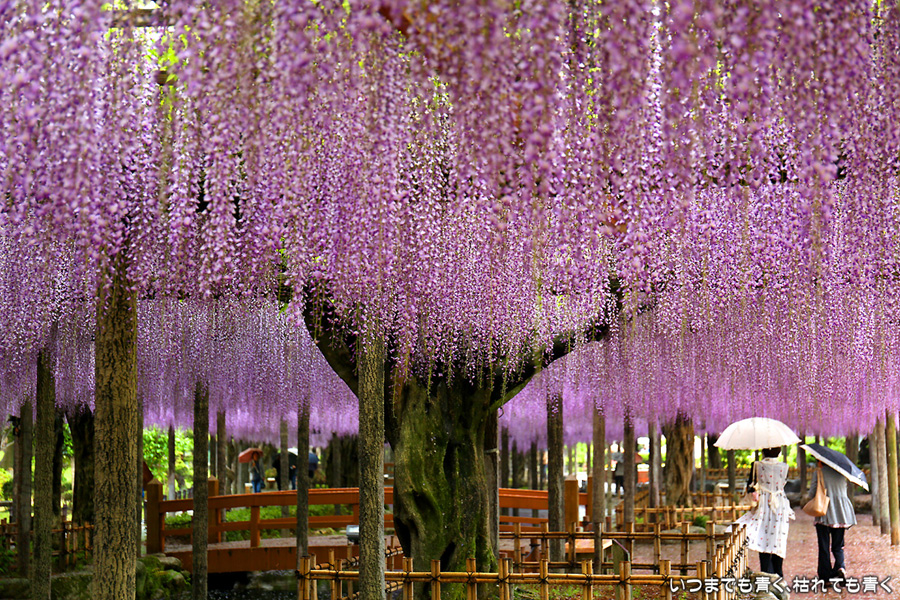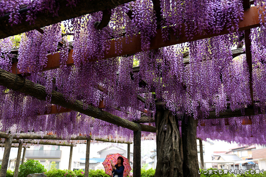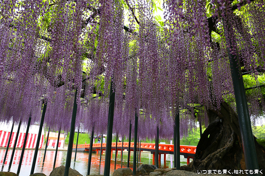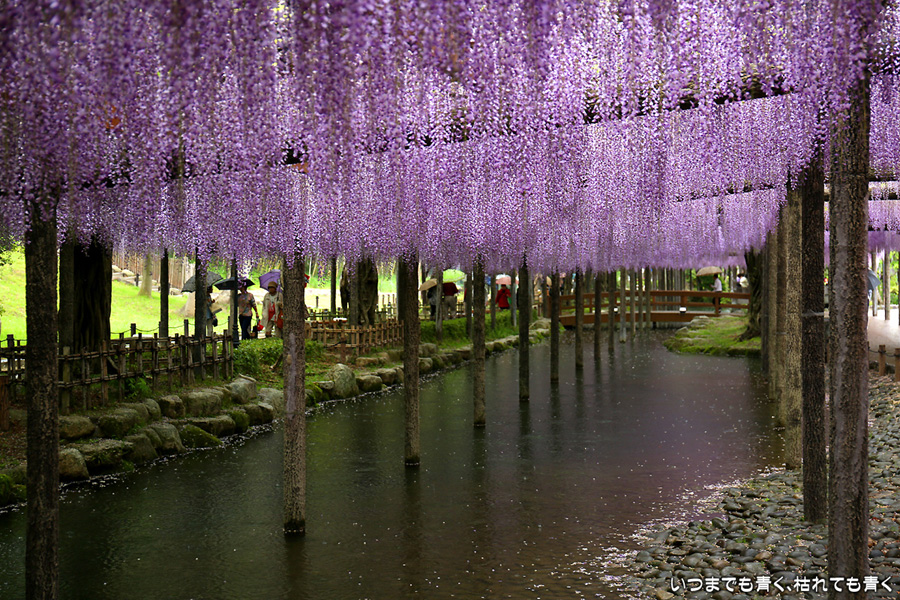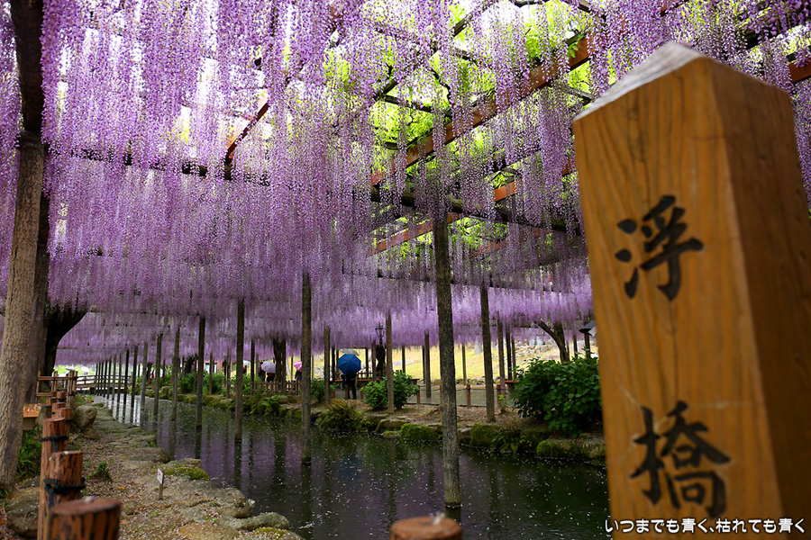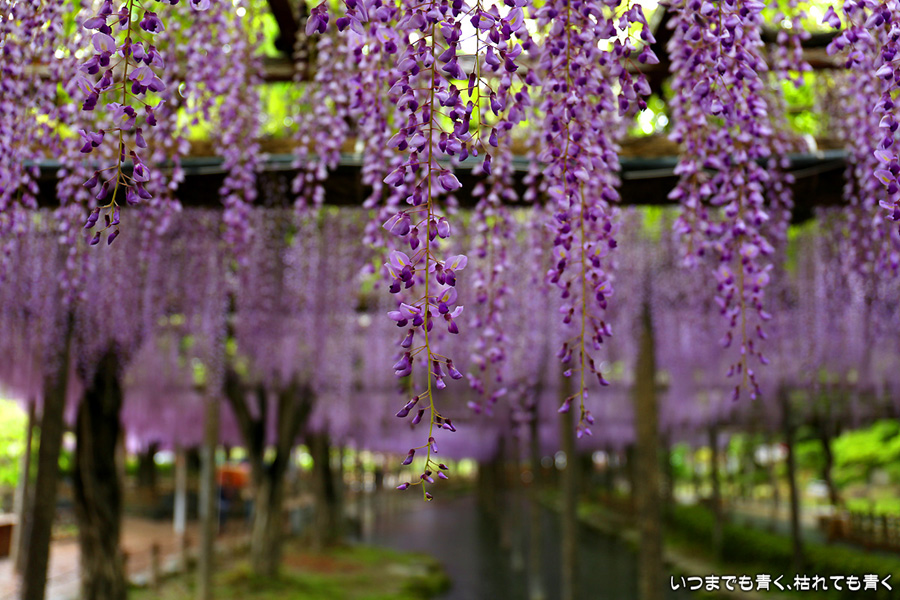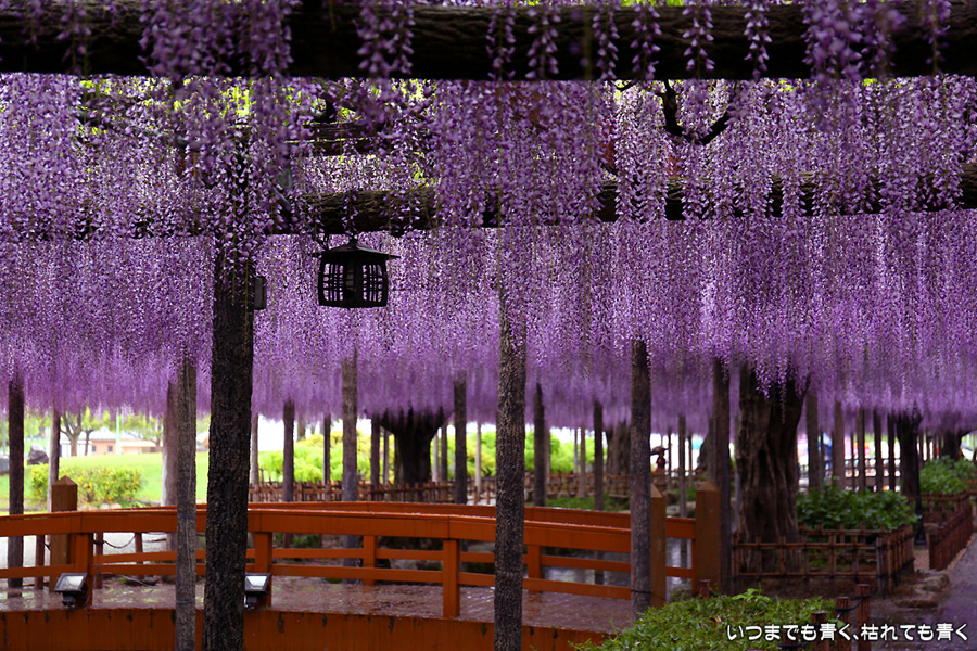 本降りの雨で人が少なくて写真撮影には好都合でしたし、絵になる景色が多かったですし、藤を撮影する場所としてはとても気に入りました。ただ、レンズ面に雨粒があたるのでカメラを上に向けられない、雨や湿気がカメラ内部に入り込む危険があるので交換レンズを使えない、傘をさしながらで姿勢が限られる、など不都合なことも多くて、疲れる撮影でした。
