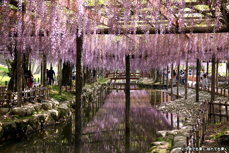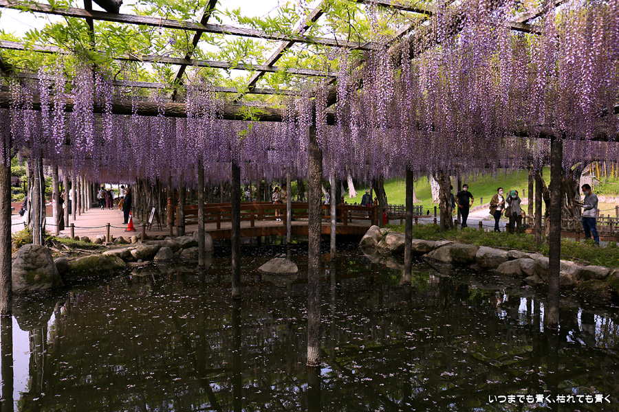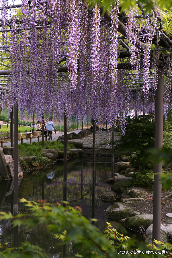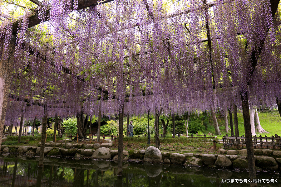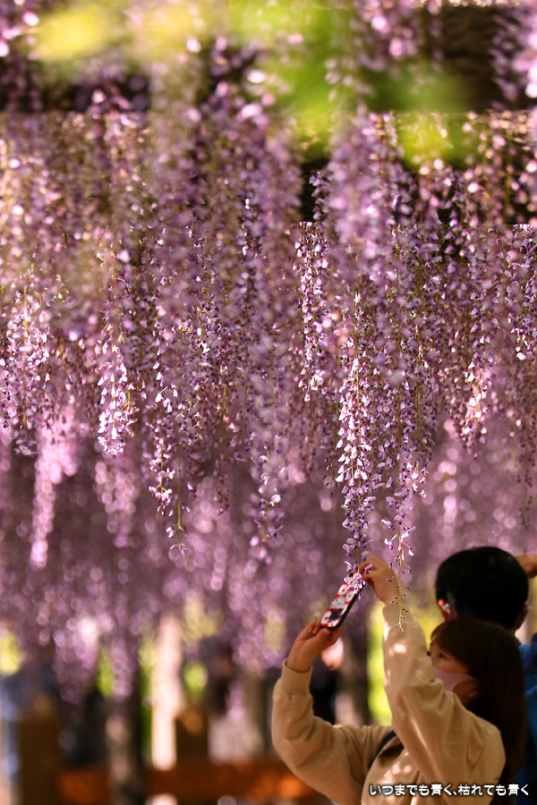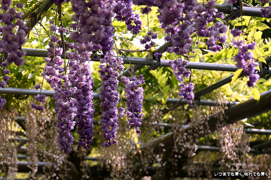 今回は2度目の訪問で、初めて来た時は雨でしたので日の差す状況での撮影は初めてになります。結果的にはあまりうまく撮影できませんでした。藤棚が立派すぎて周りの明るさに比べて藤棚の下は光が不足して色合いがイマイチです。ホワイトバランスの設定ミスもありますし、RAWデータではなくJPEGのみで保存していたのもミスでした。ホワイトバランスが適切でなかったとしてもRAWデータがあれば現像でなんとでもなったのにと悔やまれます。そういう状況なのでPhotoshopで色合いを調整しましたが、藤の花の色は微妙で、調整しているとどの色調が正しいのかわからなくなってしまいます。という言い訳ばかりの写真ですが、なんとか見ることができる形にはしました。藤の花自体はちょうど見ごろで藤棚が立派で見ごたえがあってとても素晴らしいです。写真など撮らずにのんびりと散策して楽しむのがいいと思います。