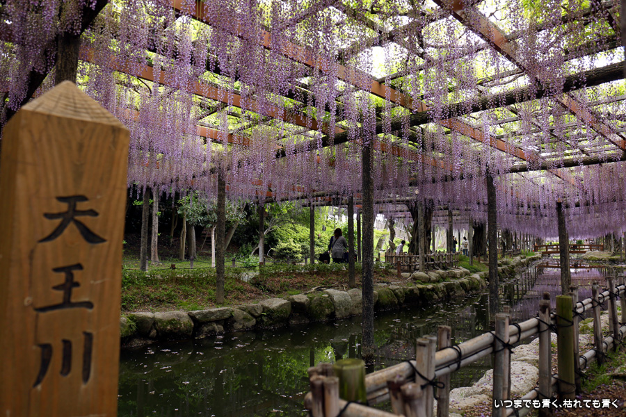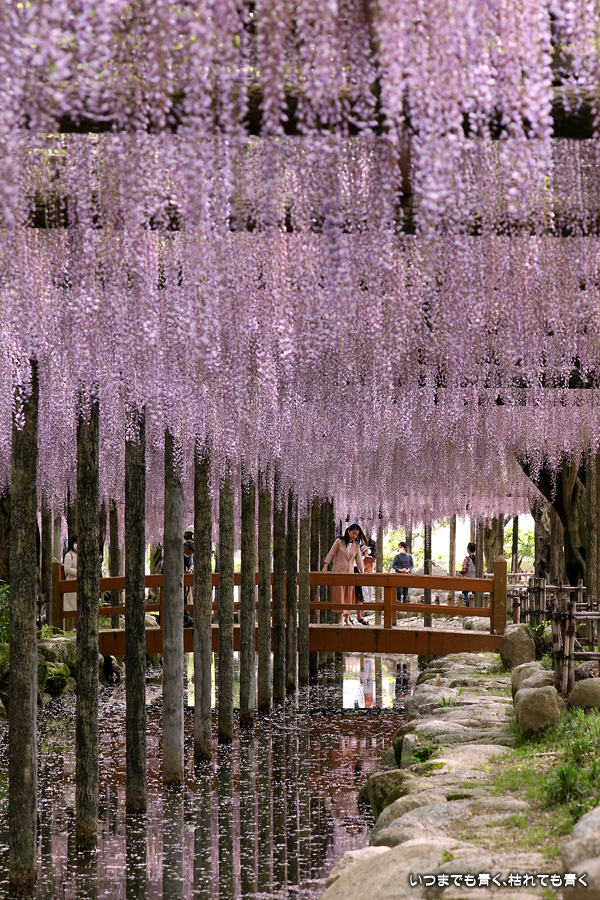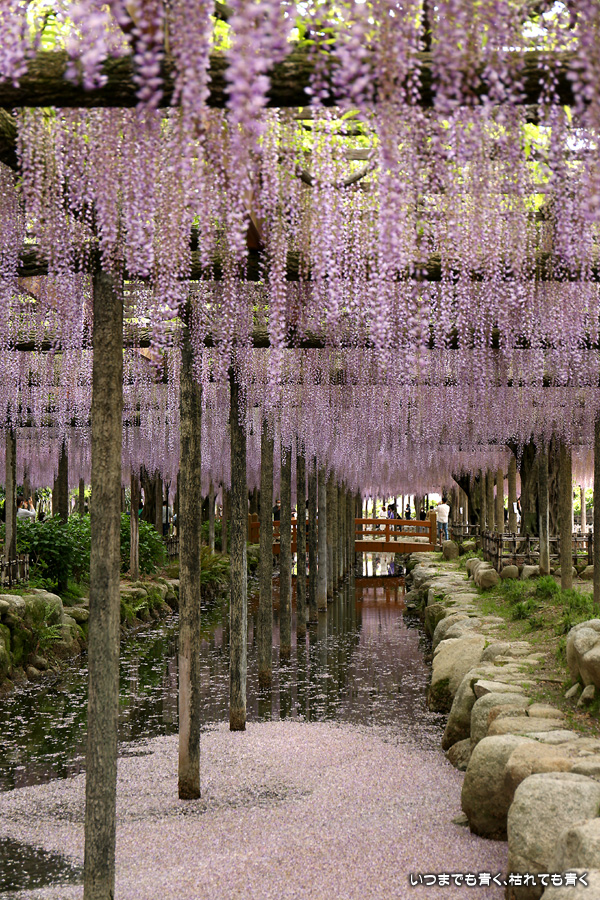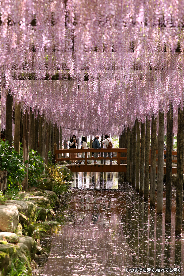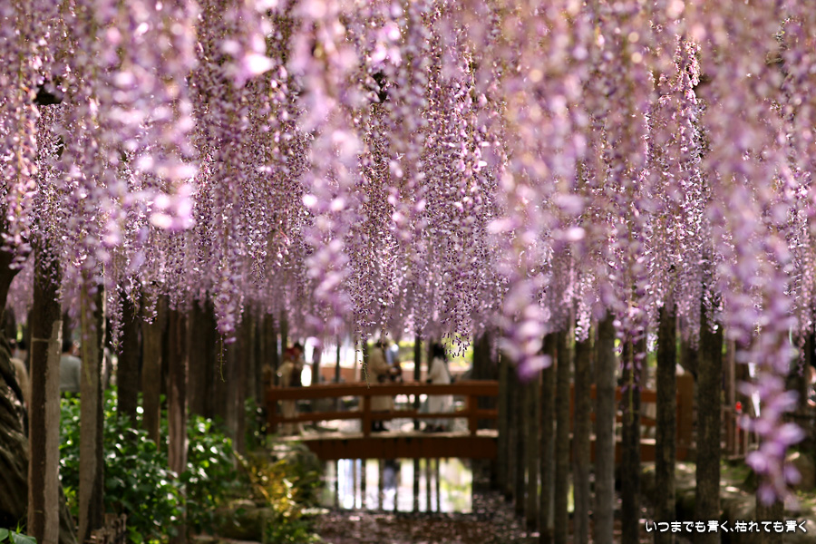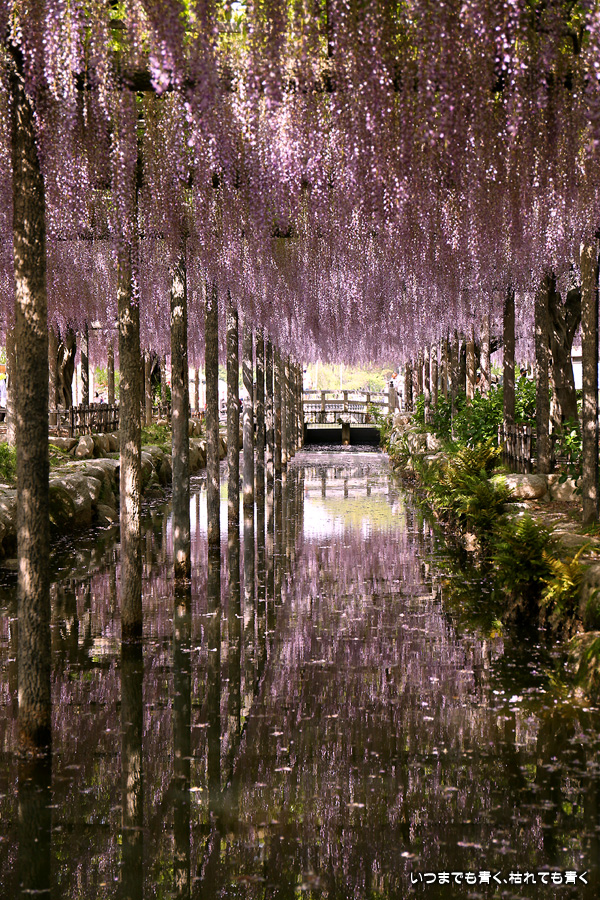 今回は2度目の訪問で、初めて来た時は雨でしたので日の差す状況での撮影は初めてになります。結果的にはあまりうまく撮影できませんでした。藤棚が立派すぎて周りの明るさに比べて藤棚の下は光が不足して色合いがイマイチです。ホワイトバランスの設定ミスもありますし、RAWデータではなくJPEGのみで保存していたのもミスでした。ホワイトバランスが適切でなかったとしてもRAWデータがあれば現像でなんとでもなったのにと悔やまれます。そういう状況なのでPhotoshopで色合いを調整しましたが、藤の花の色は微妙で、調整しているとどの色調が正しいのかわからなくなってしまいます。という言い訳ばかりの写真ですが、なんとか見ることができる形にはしました。藤の花自体はちょうど見ごろで藤棚が立派で見ごたえがあってとても素晴らしいです。写真など撮らずにのんびりと散策して楽しむのがいいと思います。