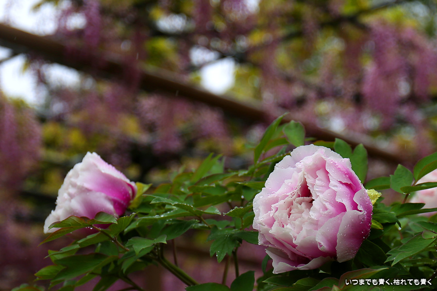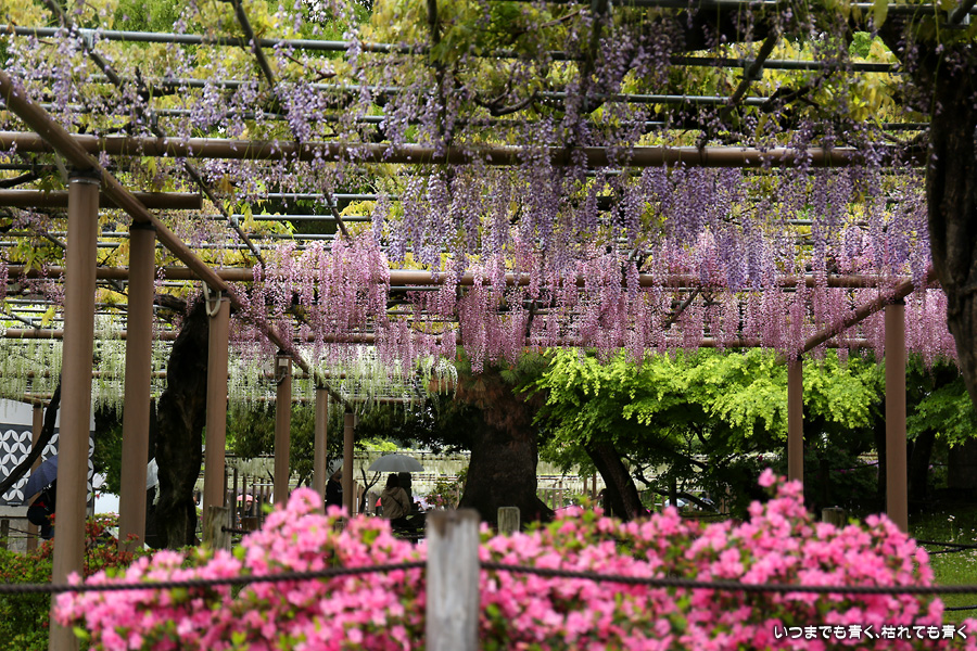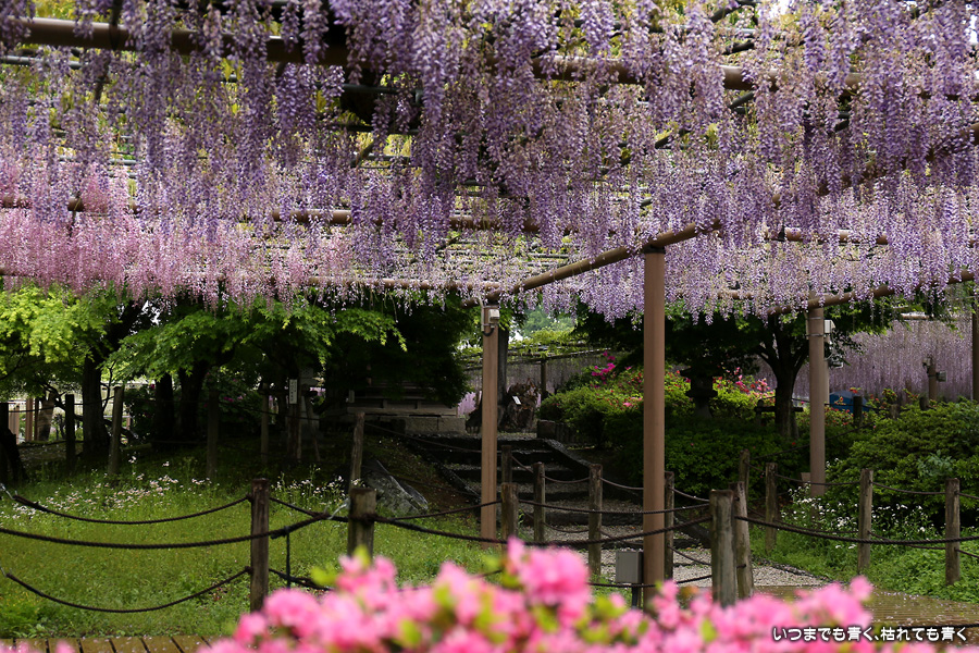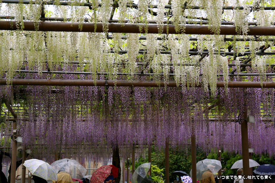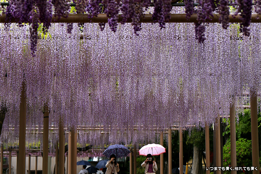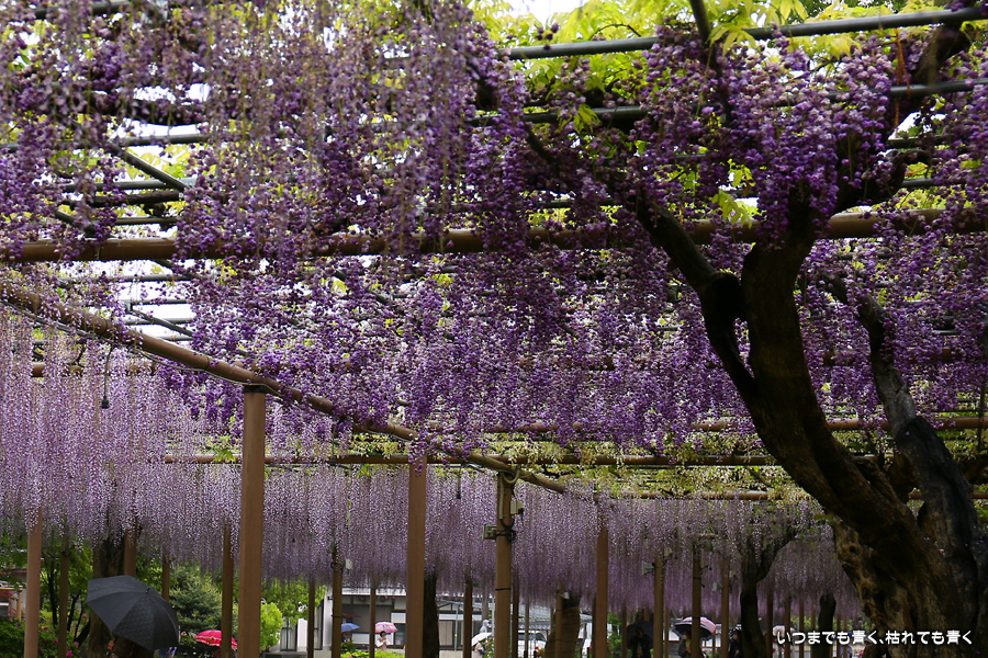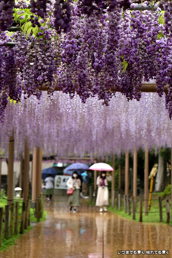 「曼陀羅寺公園」のふじは有名で今週末が見頃だと聞いたので、雨降る日でしたが行ってきました。曼陀羅寺は初めてですが、境内に曼陀羅寺公園があって、公園内の藤棚の面積は4,700uと紹介されています。ふじの種類も多くて、いろんなふじを楽しむことができます。写真撮影は、ふじの花自体は雨が似合う花ですが、カメラが雨で濡れてしまうために傘をさして立ったままの撮影が多くて、変化をつけた写真の撮影は難しい状況でした。