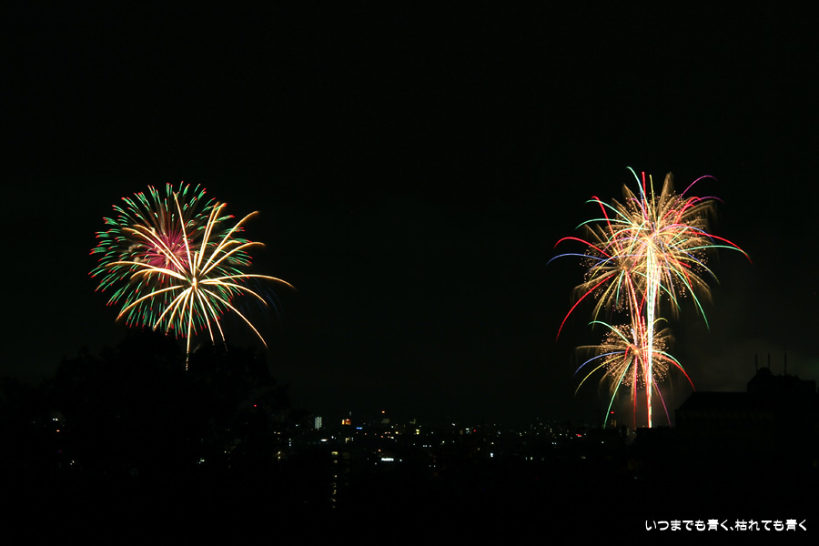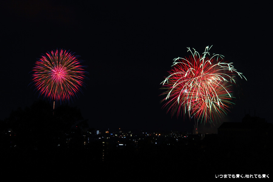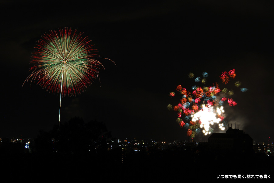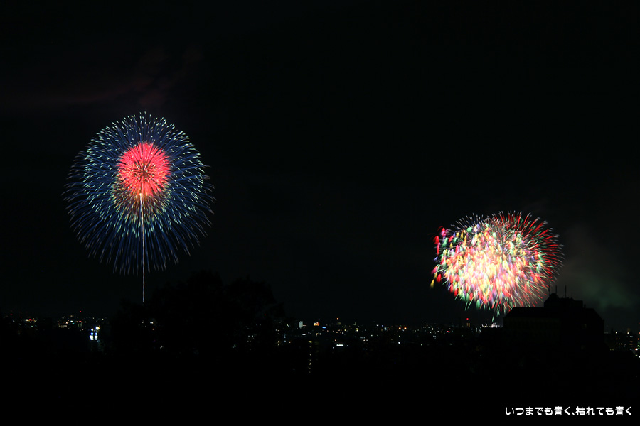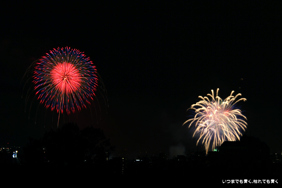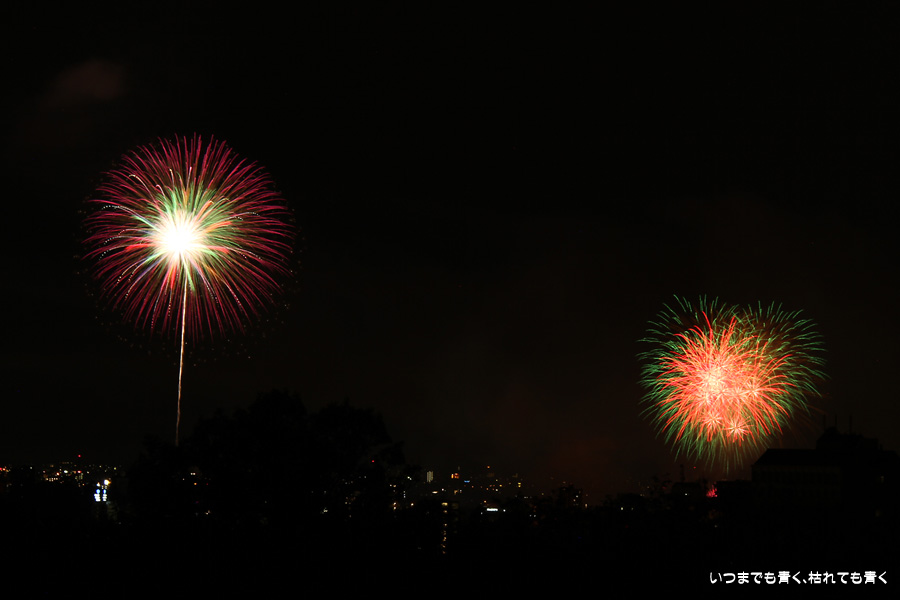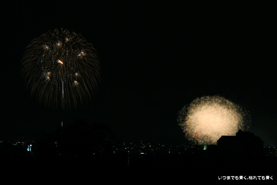 初めての岡崎の花火大会の撮影で、どこから狙うのが良いのかわからず、混雑に巻き込まれないように岡崎市東公園の志賀重昂像のある高台から狙ってみました。乙川河畔と矢作川河畔の二本立て花火ですが、それぞれ木と建物がちょうど邪魔になってしまったのと、かなり距離がありすぎて全体的にぼやっとした絵になってしまいました。岡崎東公園は、花火撮影には適した場所では無いようです。