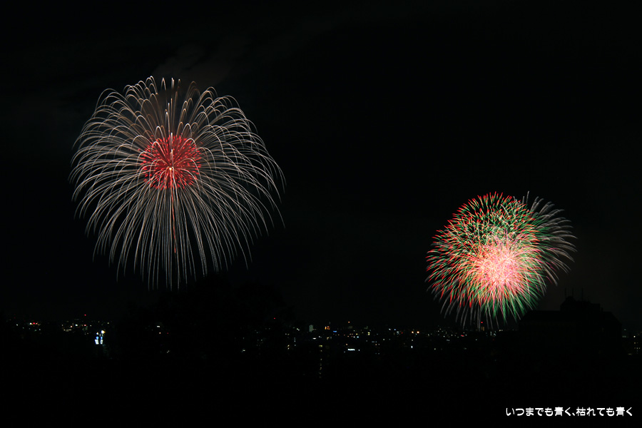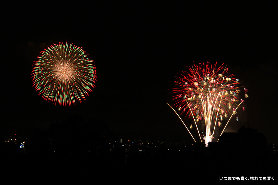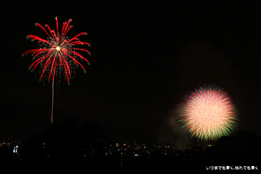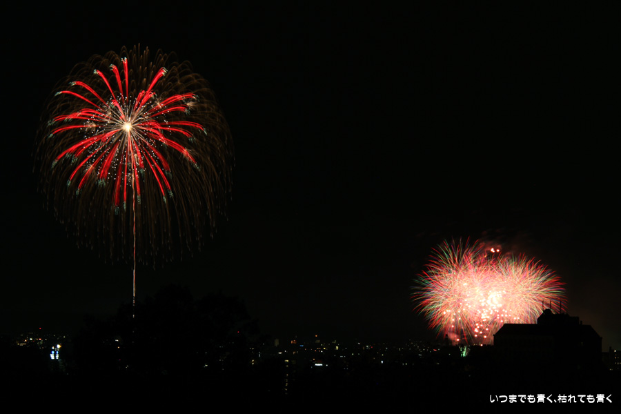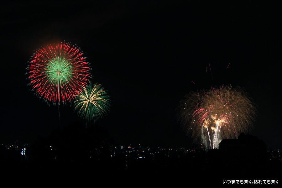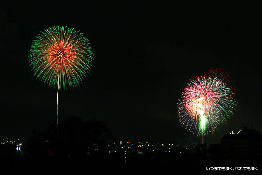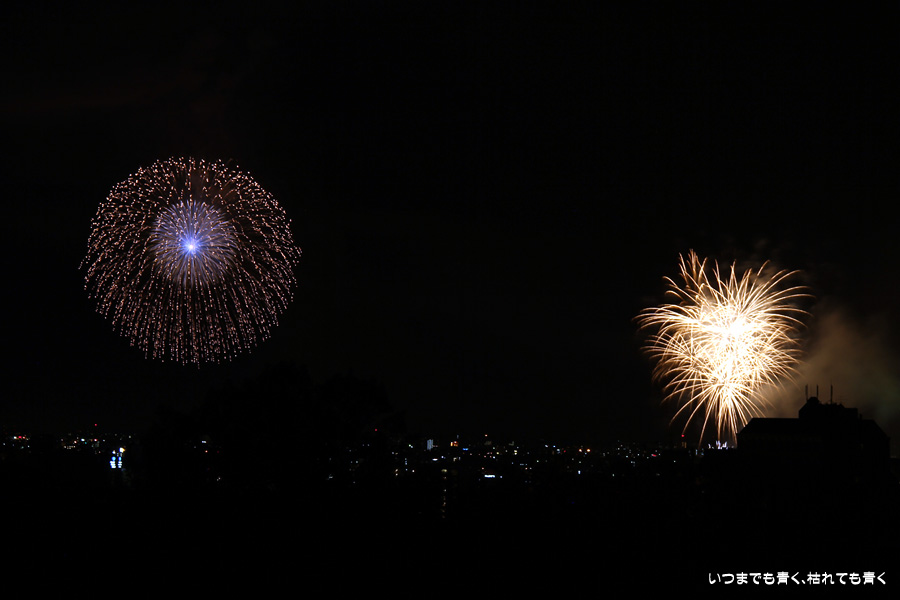 初めての岡崎の花火大会の撮影で、どこから狙うのが良いのかわからず、混雑に巻き込まれないように岡崎市東公園の志賀重昂像のある高台から狙ってみました。乙川河畔と矢作川河畔の二本立て花火ですが、それぞれ木と建物がちょうど邪魔になってしまったのと、かなり距離がありすぎて全体的にぼやっとした絵になってしまいました。岡崎東公園は、花火撮影には適した場所では無いようです。