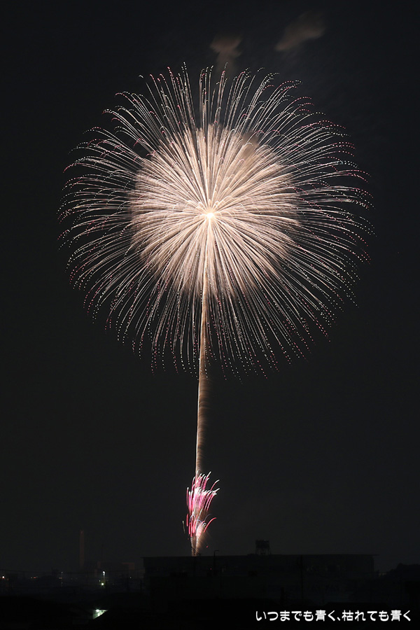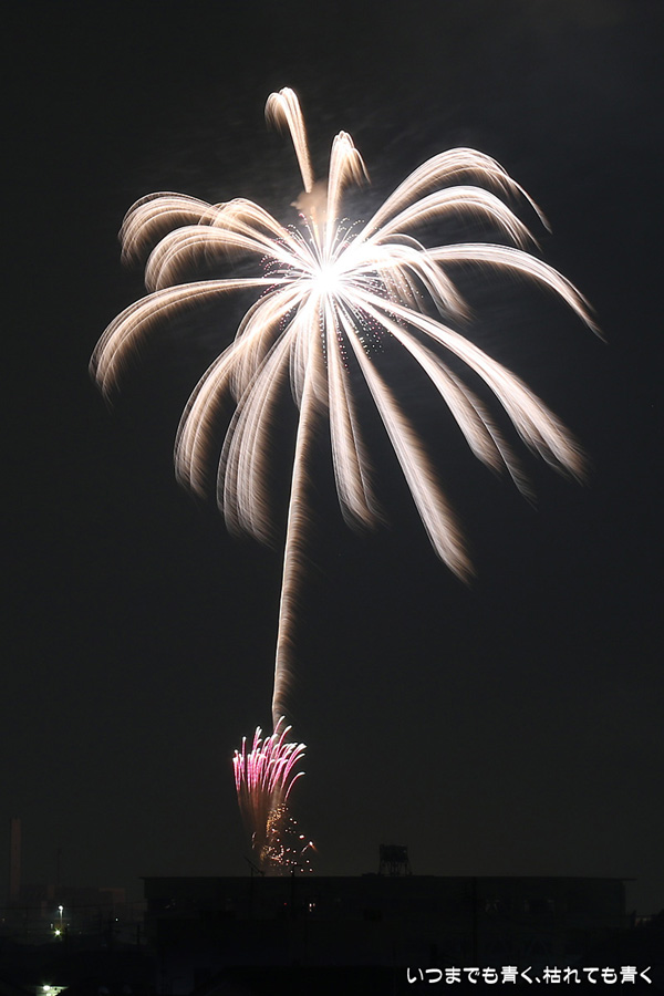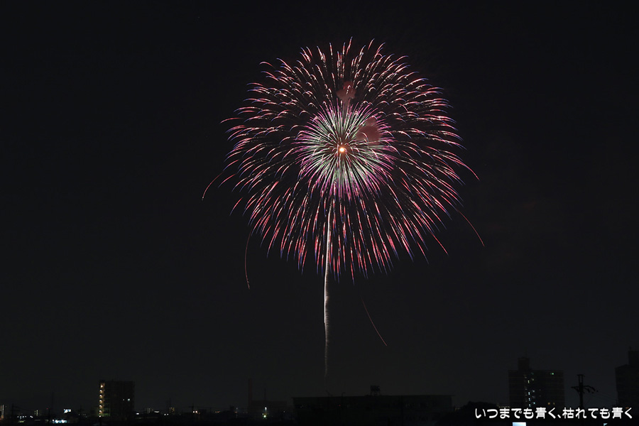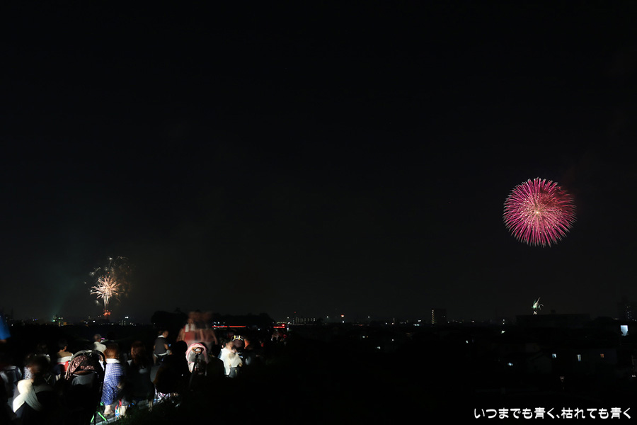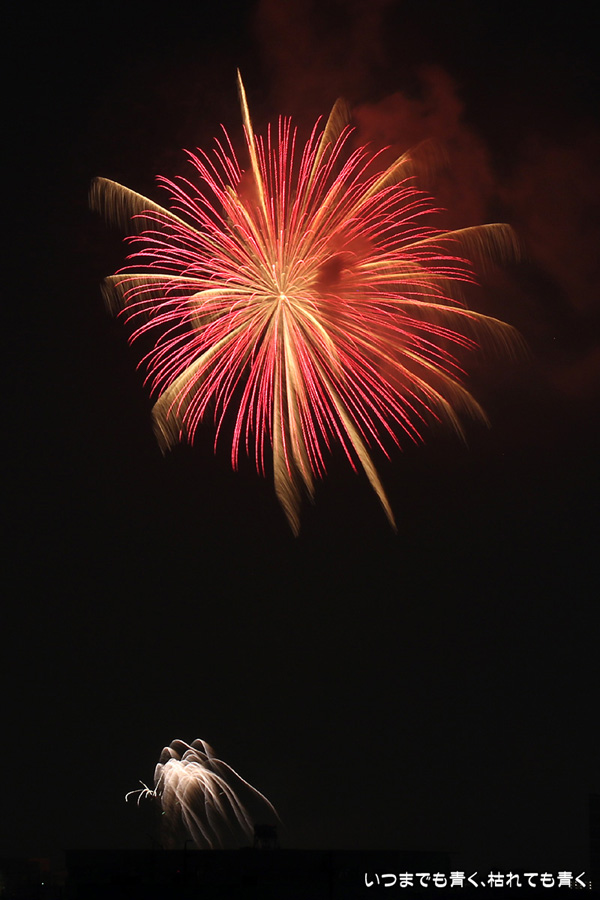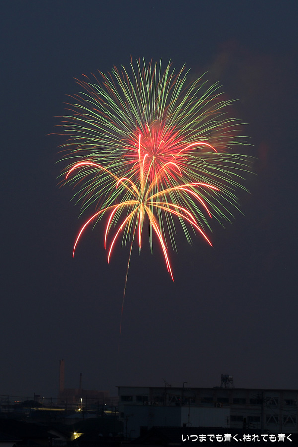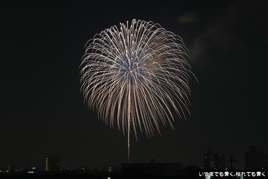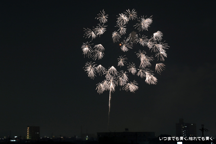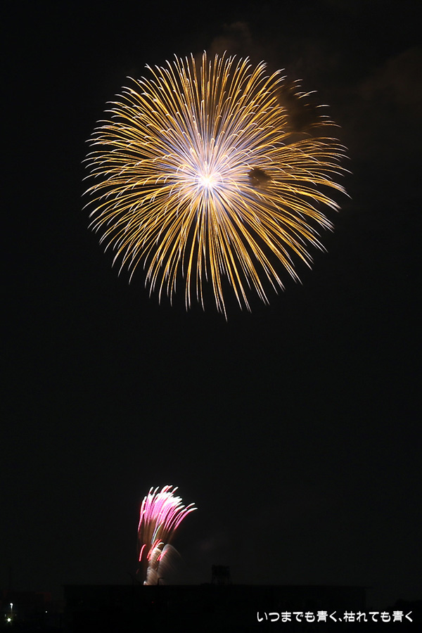 岡崎の花火は昨年初めて東公園から撮影したのですが、ちょっと遠すぎたので今年はもう少し近くでと思って矢作川西側堤防道路の国道1号線矢作橋と県道56号線日名橋のちょうど中間のあたりの場所を選びました。花火が上がってみると、これが大失敗。矢作川の打ち上げ場所と乙川の打ち上げ場所と撮影地点が正三角形に近い関係になっていて、両方の花火を一緒に入れての撮影がまったく絵になりませんでした。それぞれの花火は単調なので、競演させないと迫力がでません。そして堤防は人があふれ片側の撮影はどうしても人が入ってしまいます。満月に近い夜も空が明るくてダメですね。来年は両方が並んで見える地点(西側か東側?)を探したいと思います。途中から飽きてしまい、金曜日にブルームーン満月だった月と花火と二重露光させて、存在しない場所に月を写し込んだ写真を撮ってみたりして遊んでいました。