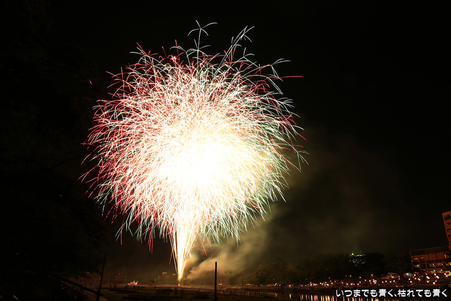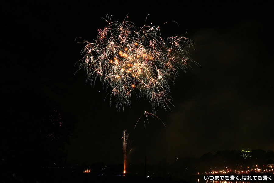 岡崎の花火は、人混みが嫌でいつも遠くから見るだけで近くでは見たことがなかったのですが、病気が判明したため行けるうちに一度は行っておこうと思って、風邪気味で体調イマイチでしたが無理して近くで撮影してきました。乙川河川敷に陣取ったのですが、矢作川河畔で打ち上げる花火は木で隠れて見えなかったものの、乙川河畔の打上花火や仕掛花火は目の前で見ることができ、迫力満点でした。やっぱり花火は近くで見るに限ります。先週の豊田市のおいでんまつりの花火よりも種類も内容も充実していたように感じました。ただ、写真撮影は近くよりも少し離れているほうが良いようです。岡崎城と一緒に撮ろうと思っていたのですがそれもあまり絵にならず、花火に近いため静止画にすると高さも感じられず、連続打ち上げが多いため単調な絵になったりとまた不満ばかりです。花火の写真としては、おいでんまつりの花火のほうがお気に入りは多かったです。近くでは静止画の美しさよりも動画の迫力と思いましたので、今回は動画も少し撮りましたので