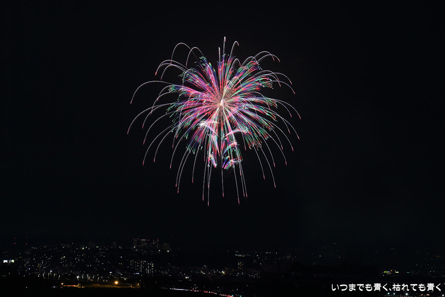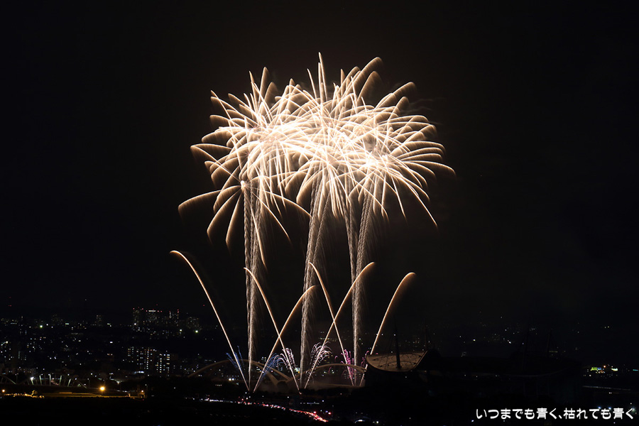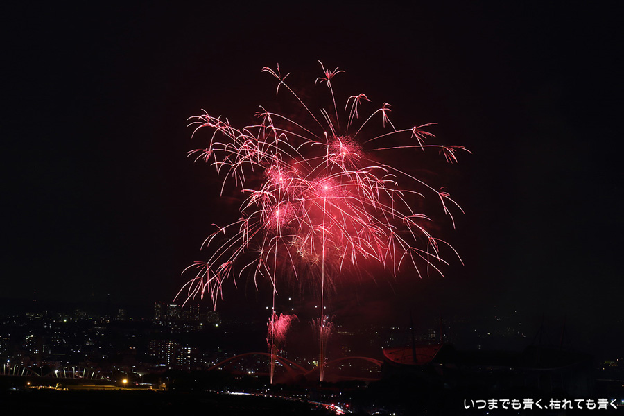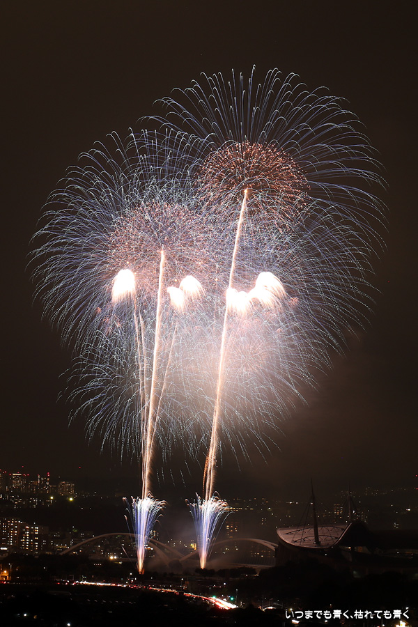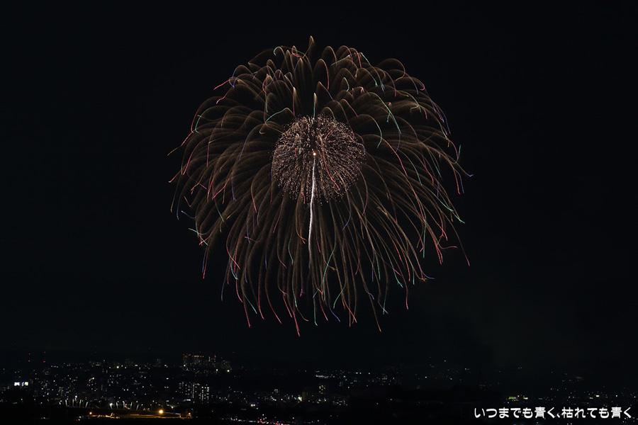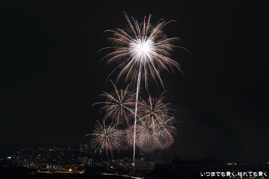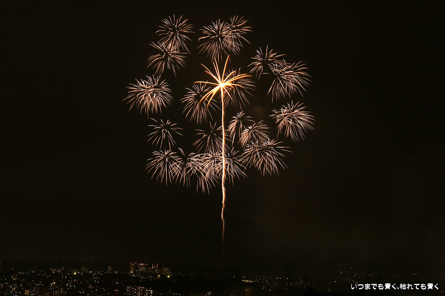 などあたらめて難しさを痛感しました。そんな状態でしたので、今回は面白い写真が少なかったように思います。花火自体も年々豪快さが乏しくなってきている感じもします。また、ここ3年は同じ場所からの撮影なので同じような写真ばかりになってきました。来年は撮影場所を変えたほうが良いかもしれませんが、他に良い場所を探すのも大変そうです。なお、重量級の望遠レンズで撮影した写真は三脚が耐え切れず、カメラが微妙に揺れて花火の軌跡が波打ってしまっているものがあります。細部には目を瞑ってご覧ください。