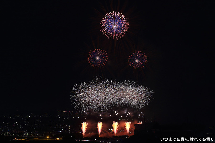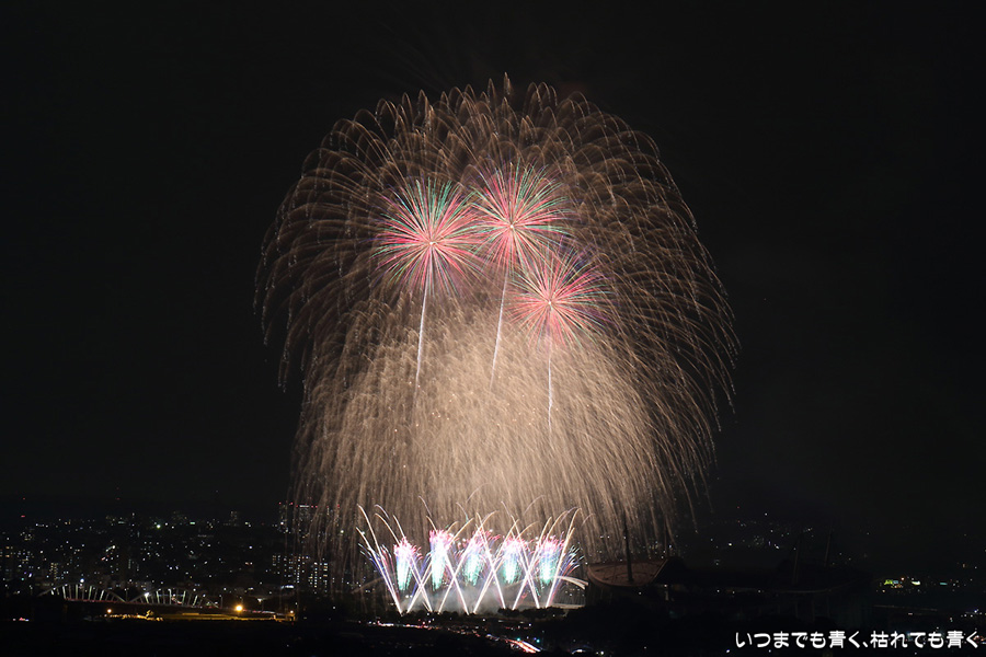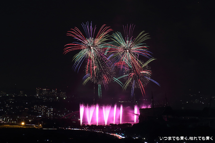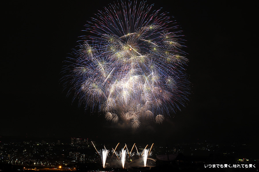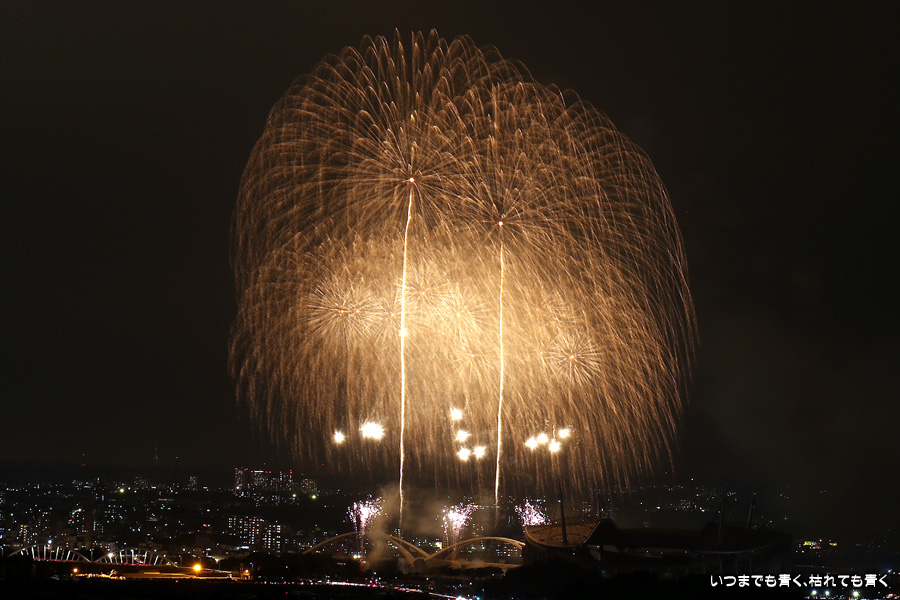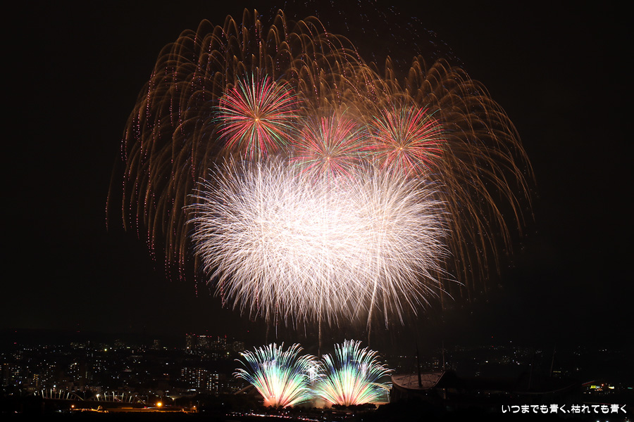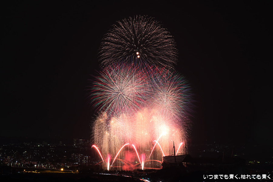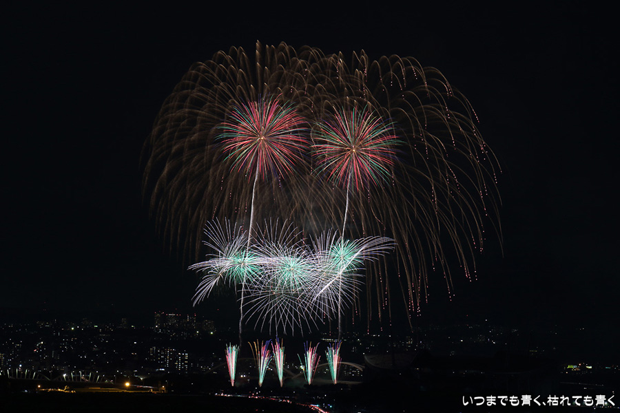 などあたらめて難しさを痛感しました。そんな状態でしたので、今回は面白い写真が少なかったように思います。花火自体も年々豪快さが乏しくなってきている感じもします。また、ここ3年は同じ場所からの撮影なので同じような写真ばかりになってきました。来年は撮影場所を変えたほうが良いかもしれませんが、他に良い場所を探すのも大変そうです。なお、重量級の望遠レンズで撮影した写真は三脚が耐え切れず、カメラが微妙に揺れて花火の軌跡が波打ってしまっているものがあります。細部には目を瞑ってご覧ください。