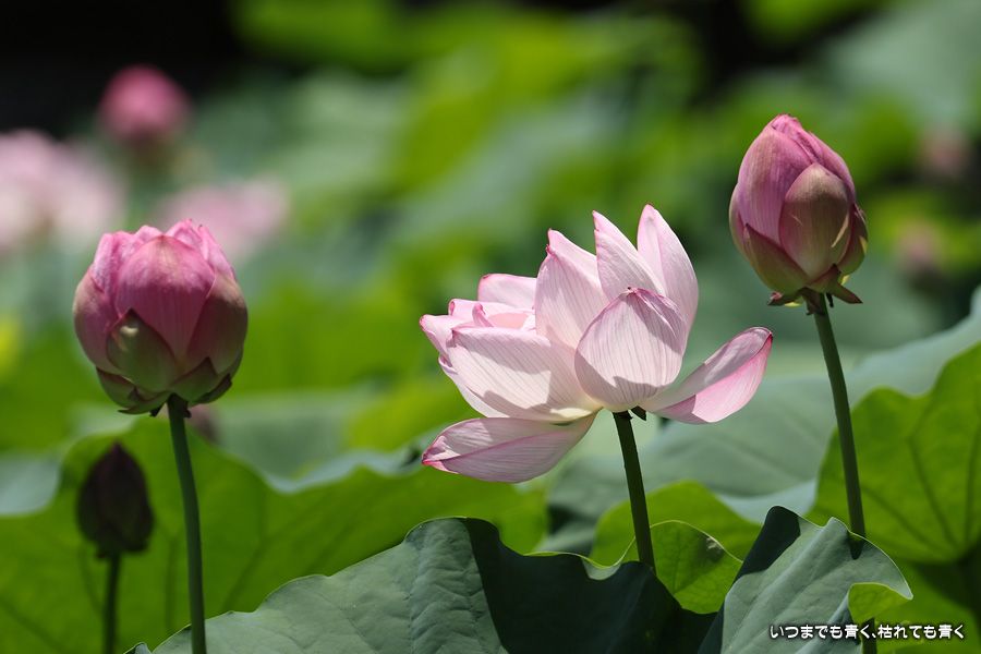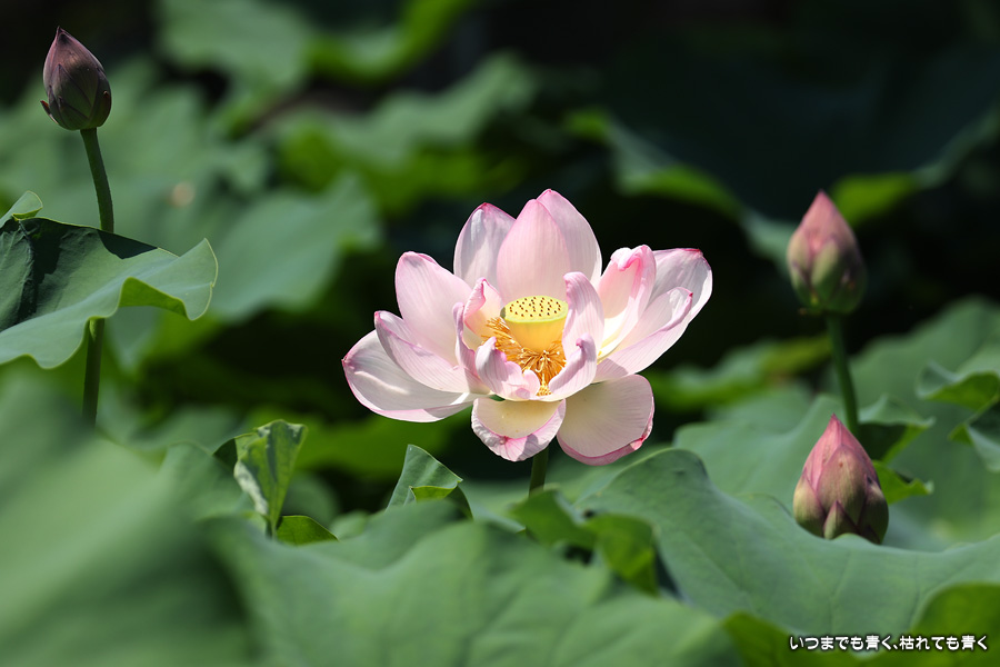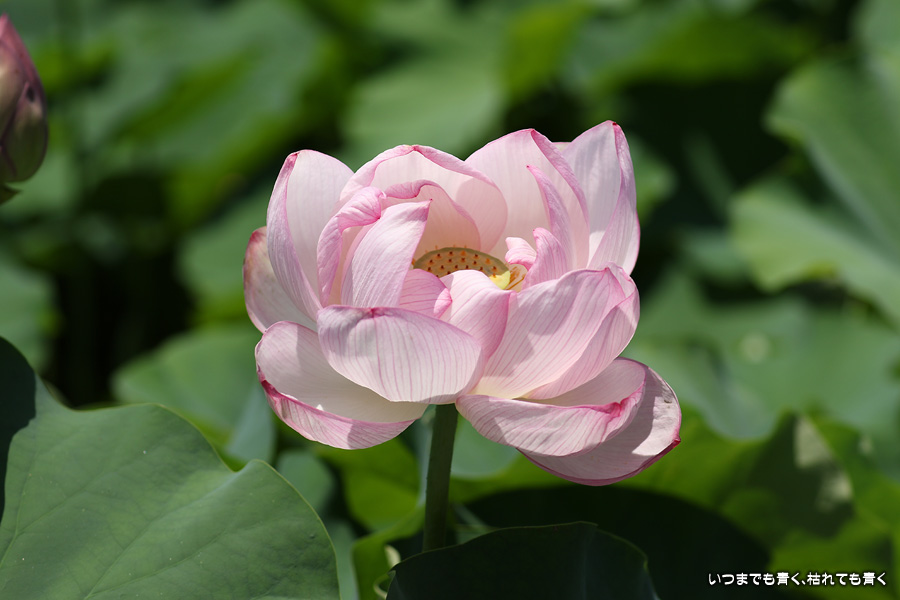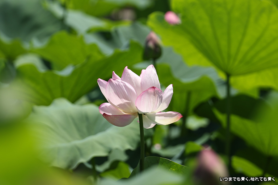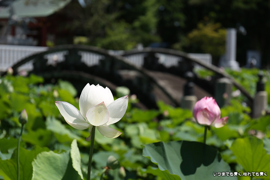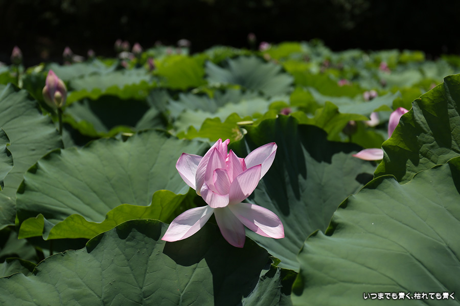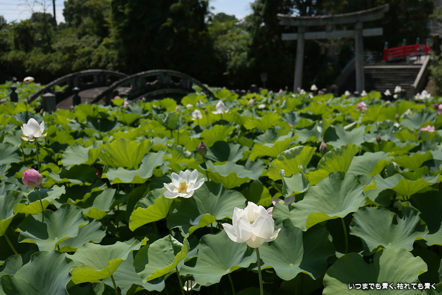 紫陽花が終わりましたので、今週は蓮の花を撮影するために岡崎市の伊賀八幡宮にやってきました。伊賀八幡宮に蓮の花を見に来るのは5年ぶりとなります。5年前は蓮の密集度も低く池の水面が大きく見えていましたが、今回は池一面に立派な蓮の葉が高く伸びて池の水面はまったく見えません。ただ、来る時間が少し遅く、きれいに開いている花はそう多くはなく、中途半端な開き方だったり、きれいに開いていた花も写真を撮っているうちに閉じてしまったり、強い日差しのせいか花びらの傷んでいる花もあったりとか、撮影対象の花が限られてしまい写真としては面白味のないものが多くなってしまいました。
